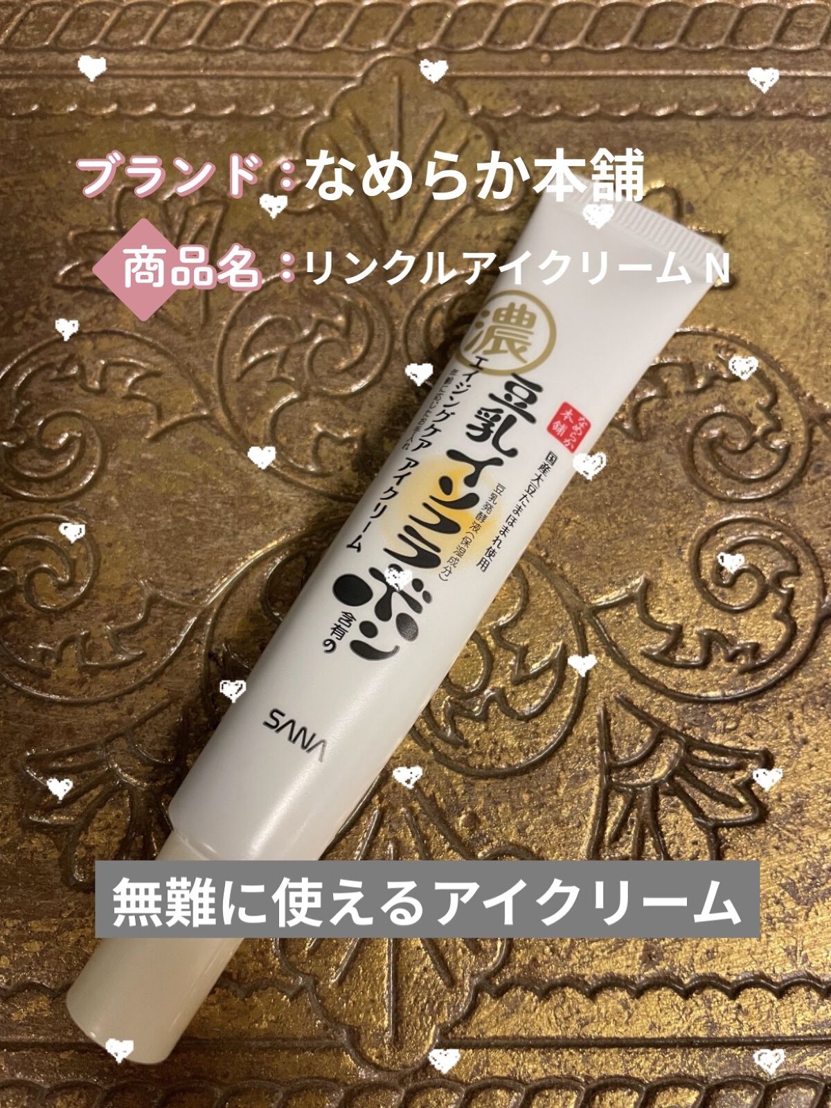 - ピュアレチノール※を新配合!濃厚アイクリームでもっちりハリeyes ※ 保湿成分 「リンクルアイクリーム N」は、『なめらか本舗』オリジナルの豆乳発酵液*1に加え、ピュアレチノール*1とビタミンE誘導体*2を新配合したもっちりとしたハリのある目元に導く「アイクリーム」です。 密着ポリマーがお肌の上で均一な膜を形成し、目元のハリ感をサポート。 毎日のスキンケアに取り入れていただくことで、年齢の出やすい目元をしっかりケアします。 〔①ピュアレチノール*1×豆乳発酵液*1×ビタミンE誘導体*2配合〕 「なめらか本舗」オリジナルのイソフラボン含有の豆乳発酵液*1に加え、ピュアレチノール*1を新配合。 さらに、ビタミンE誘導体(TPNaⓇ)*2も配合し、年齢の出やすい目元をしっかりケアします。 ・ピュアレチノール:ビタミンAの一種でハリのある目元に! ・豆乳発酵液:弾力感・うるおいを与えふっくらした目元に! ・ビタミンE誘導体(TPNaⓇ):お肌にぐんぐん浸透*3してイキイキした目元に! 〔②密着ポリマーで目元にハリ感〕 密着ポリマーがお肌の上で均一な膜を形成します。もっちりとハリのある目元に導きます。 *1 保湿成分 *2 トコフェリルリン酸Na(保湿成分) *3 角層まで