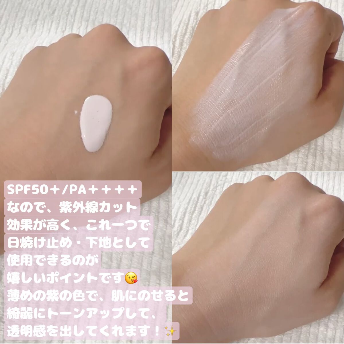 みずみずしい感じで、とっても伸びがよいので するするとつけられます! 肌の補正効果も高く、肌を綺麗に見せてくれ、 トーンアップしてくれます! めちゃくちゃカバー力があるので、 肌の調子がいい時は、上からコンシーラーで少し 赤みやクマを隠して、その上からパウダーで ベースメイク完了します! 紫外線カット効果もあり、 SPF50+ PA++++ なので日焼け止めとしても 使えるのが嬉しいポイントです! 皮脂崩れ、汗に強いので、 マスクしてても私は崩れは そんなに気にならないです! カバー力も欲しいけど、日焼け止めとしても 使いたい時に抜群で、年中使える下地です!