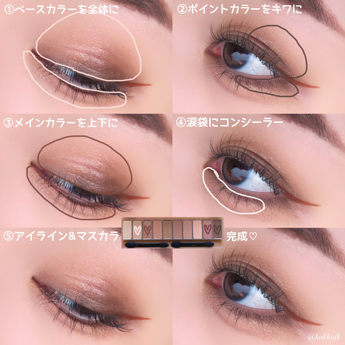 - 肌なじみの良い、鮮やかな発色で目元を華やかに彩る捨て色なしの10色アイシャドウパレット 異なる3種のテクスチャーを自由に組み合わせて、グラデーションも思いのままに。 NEW 2023.4 ・肌トーンにあう配色を詰め込んだトレンドカラー 肌トーンに合わせて、自分に似合うトレンドカラーが楽しめる♡ パーソナルカラー×トレンドカラーの掛け合わせパレットで、デイリーメイクもスペシャルメイクも気分にあわせてなりたい自分に! ・むにゅっとジェル質感ラメで高密着、煌めく目元 パレットの中でもポイントとなる大きめ粒子のラメは、ジェルのような新質感で落ちにくく肌にぴったりと密着します。キラキラとした目元をキープします。 ・使うカラーは大きめに!リアル捨て色なしパレット ベースやラメのよく使うカラーと締め色や濃い色等の減りが少ないカラーを異なるサイズで詰め込んだ、リアル捨て色なしパレット! <使用方法> 付属のデュアルシャドウブラシでベースカラーをまぶた全体に塗り広げます。細いブラシでグラデーションや目尻、アイライン、涙袋などのポイントカラーをのせて仕上げます。
