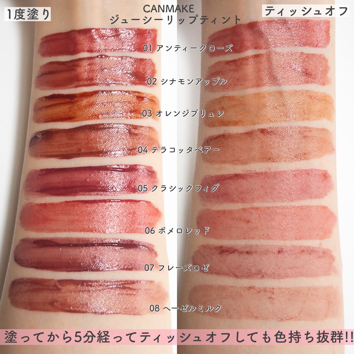 【使った商品】キャンメイクジューシーリップティント【色味】8色全て【色もち】〇【質感】こってり、つやつや【保湿】△【良いところ】カラバリ豊富、発色【イマイチなところ】パッケージでカラー判断が難しいこちら全8色ご紹介です!【01アンティークロー...