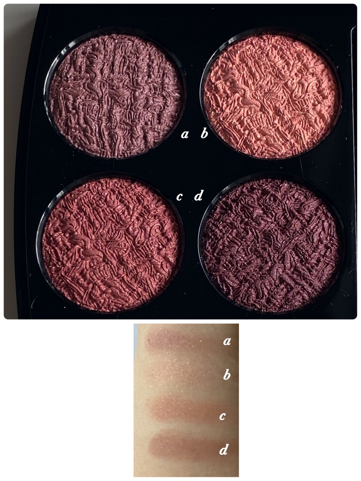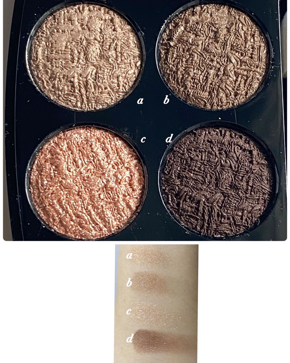 特に下3色のキラキラが信じられないくらい可愛いい煌めき𖤐˒˒ 𖤐˒˒ 𖤐˒˒ 上3色はマット。上の3色も今っぽなカラー🤎 落ち着いたピンクベージュパレットで、使いやすそう𓂃 𓈒見た目より手に出すと明るくシアーな発色。私にはこれくらいの発色が安心。