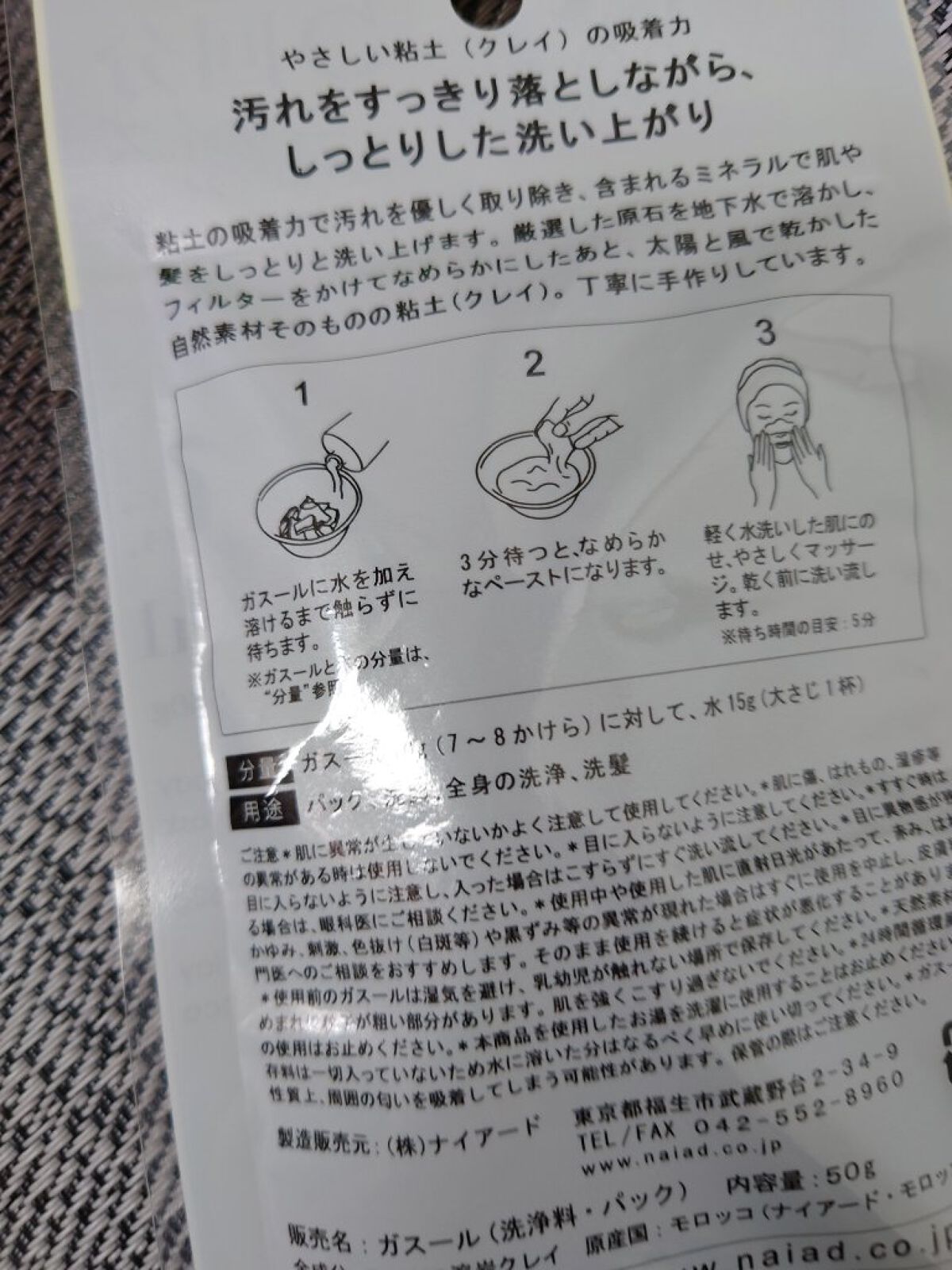 モロッコで古くから石鹸のように使われてきたクレイ(粘土)・ガスール。 ナイアード様ののガスールは、原石を地下水で溶かし、ろ過して、太陽と風で乾かしたシンプルなもの。 粘土の吸着力が肌の汚れを取り除き、ミネラルが顔や髪、身体をしっとりとなめらかに洗い上げ、整えます。 不要な毛穴汚れがスッキリして、くすみも取れたような気がするの。 定期的に使って、肌色のトーン変化を実感できたらいいな。