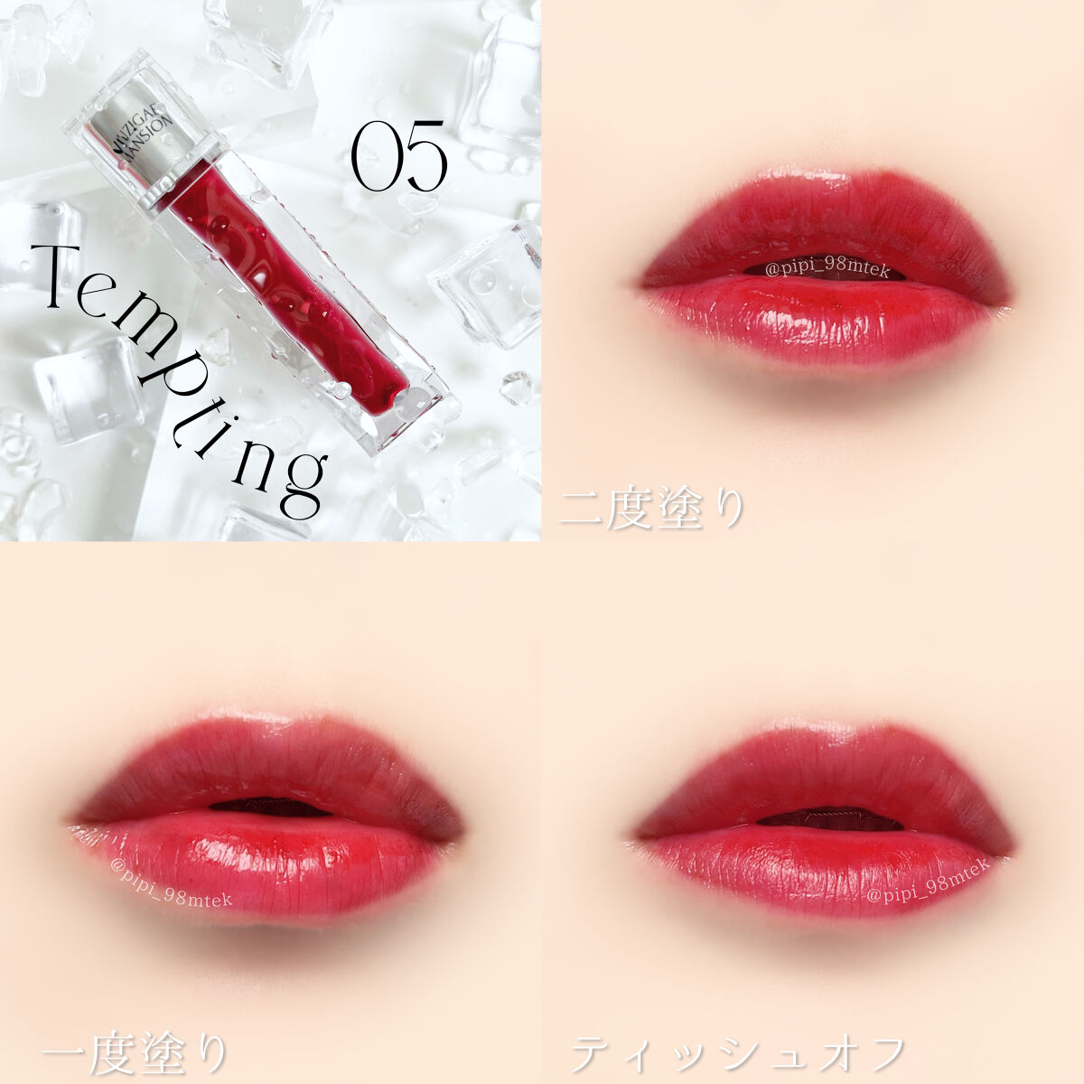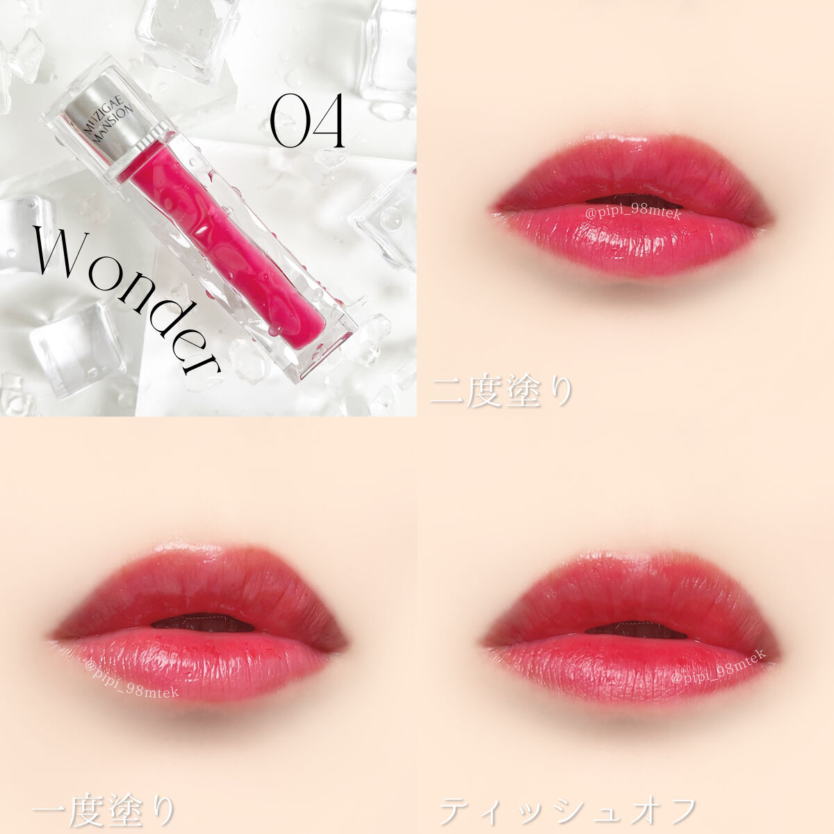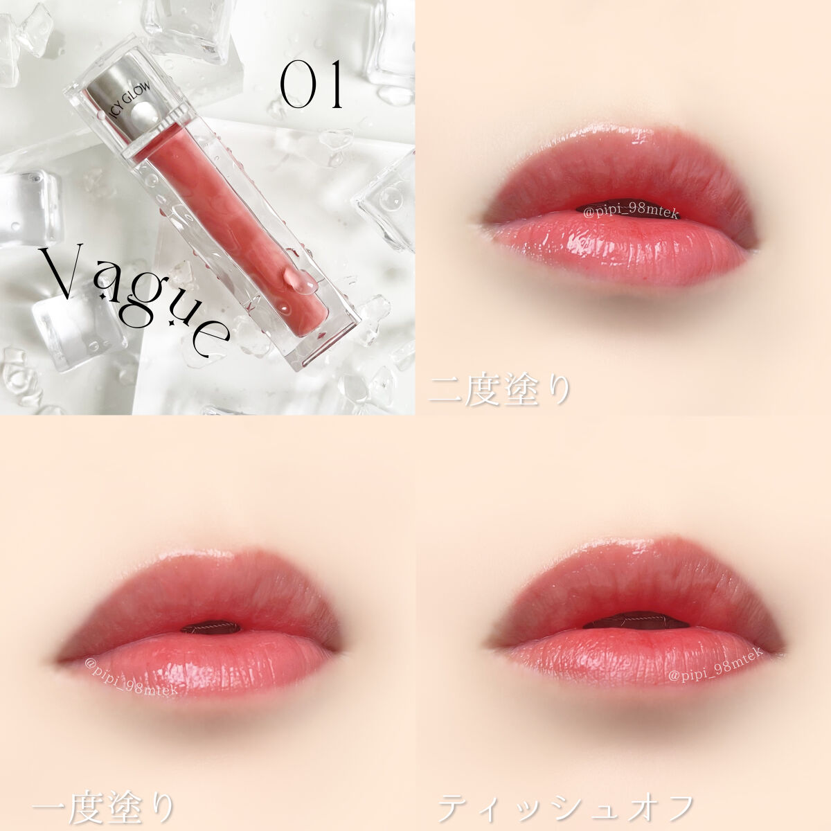 - ムジゲマンションの3つ目のコレクション アイシーグロウはアイスキューブを 洗練された感覚で表現したグロッシーティントです。 アイシーグロウはムジゲマンションのラインナップの中で、最も澄んだ華麗さを感じられるコレクションで、うっすら溶けた氷が作り出す 水光のように水気のあるしっとりとしたリップを演出します。 半透明な処方が本来の唇の色と調和し、幻想的で混じりけのない神秘な雰囲気を醸し出し、 好奇心を動かします。
