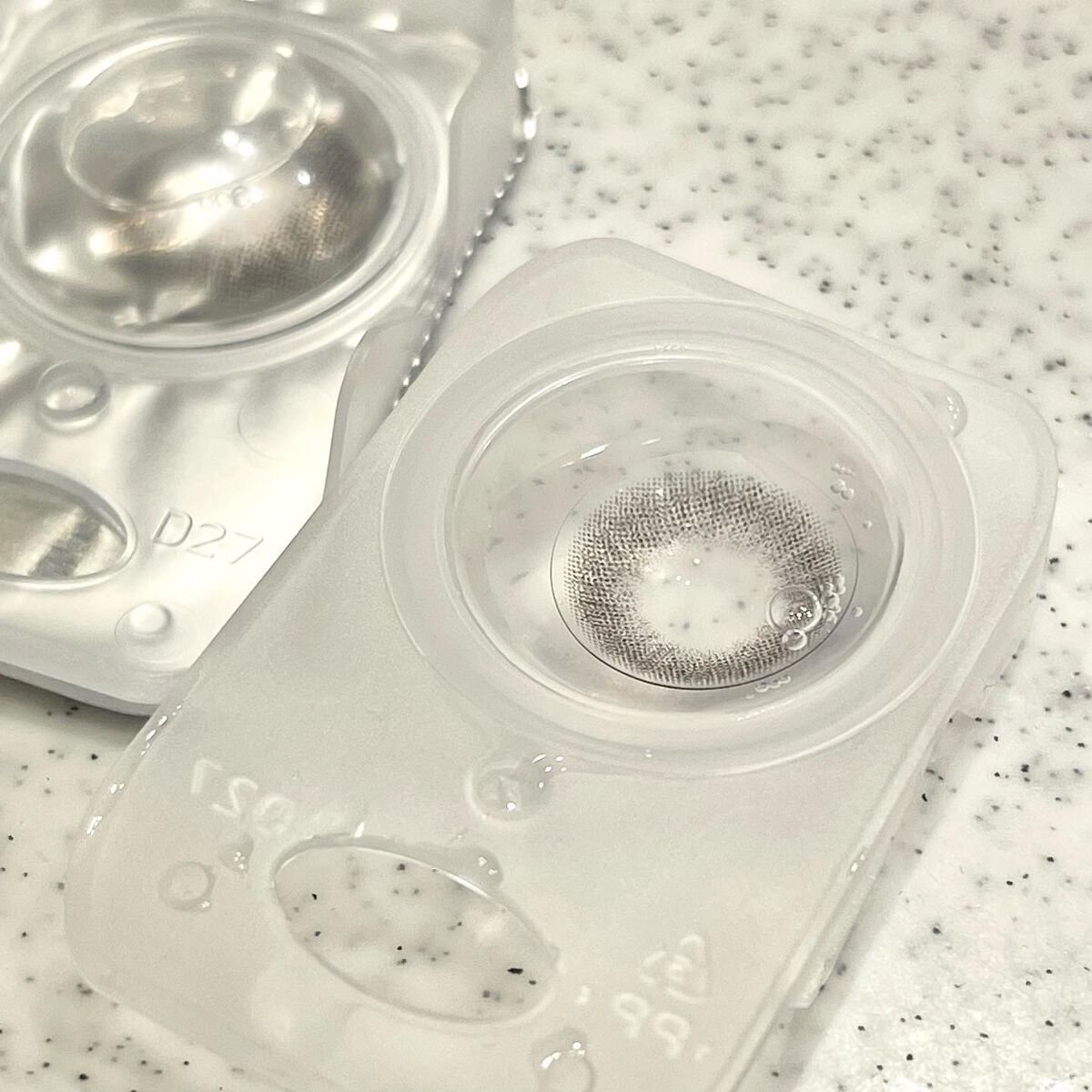 絶妙なブルーグレーの色味のある透け感カラコン! ぼやけるようなプリントだから、パキッとならず自然になじむ! 付け心地もゴロゴロしないし快適🫧 ブルー系カラコン好きだから正直めっちゃ気に入った🎀