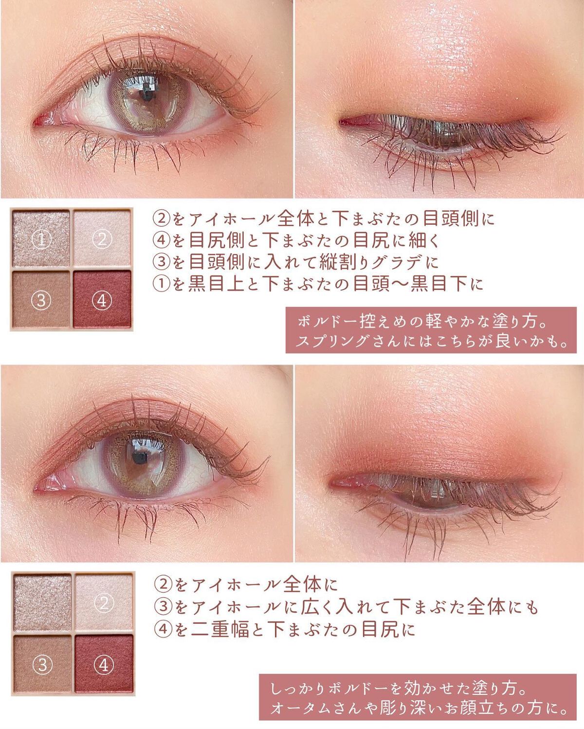 - ラメ・パール・マット3質感の4色アイシャドウ。 肌馴染みの良いベージュを基調としたカラー。ラメ・パール・マットの3質感を重ねて、自然にまぶたを強調し奥行のある大きな目元へ。 しっとり溶け込むような柔らかなパウダーなので、スルスル伸びてまぶたにピタッと密着。保湿成分(スクワラン・ホホバ種子油)配合。