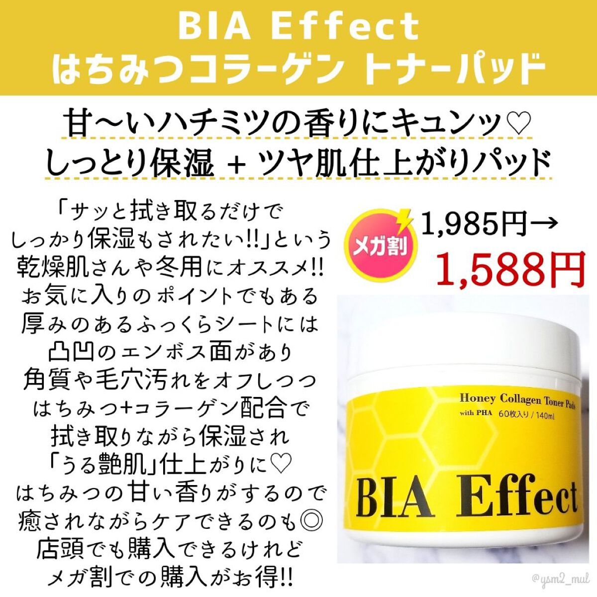 \はちみつのあま~い香りが大好物♪高保湿トナーパッド/BIAEffect(ビアエフェクト)はちみつコラーゲントナーパッド60枚140ml660円→559円(メガ割価格)パックなどのOEMを手掛けていた会社が立ち上げた韓国のスキンケアブランド、...
