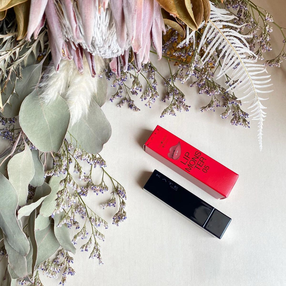 KATEケイトリップモンスター05 ダークフィグくすみが強いブラウンレッドカラー。でも、透け感もあって可愛い。塗ってしばらく放置するとティッシュオフしてもつかないし色持ちもよくてホント助かる!イエベもブルベも使いやすいニュートラルカラーじゃな...
