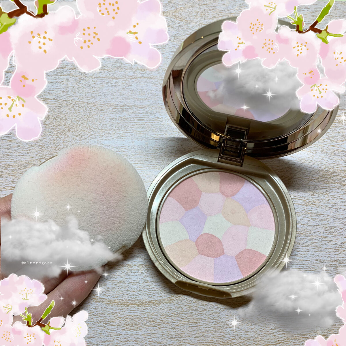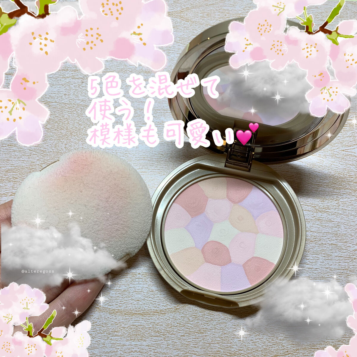 パッケージはピカピカ🌟で ミラー代わりにもなります! パウダーは白、うすピンク、ピンク、オレンジ、紫の5色が入っていて、くるくる混ぜて使います✊🏻 つけてみると、たしかに血色感が出て、自然にトーンアップされた感じになります😙
