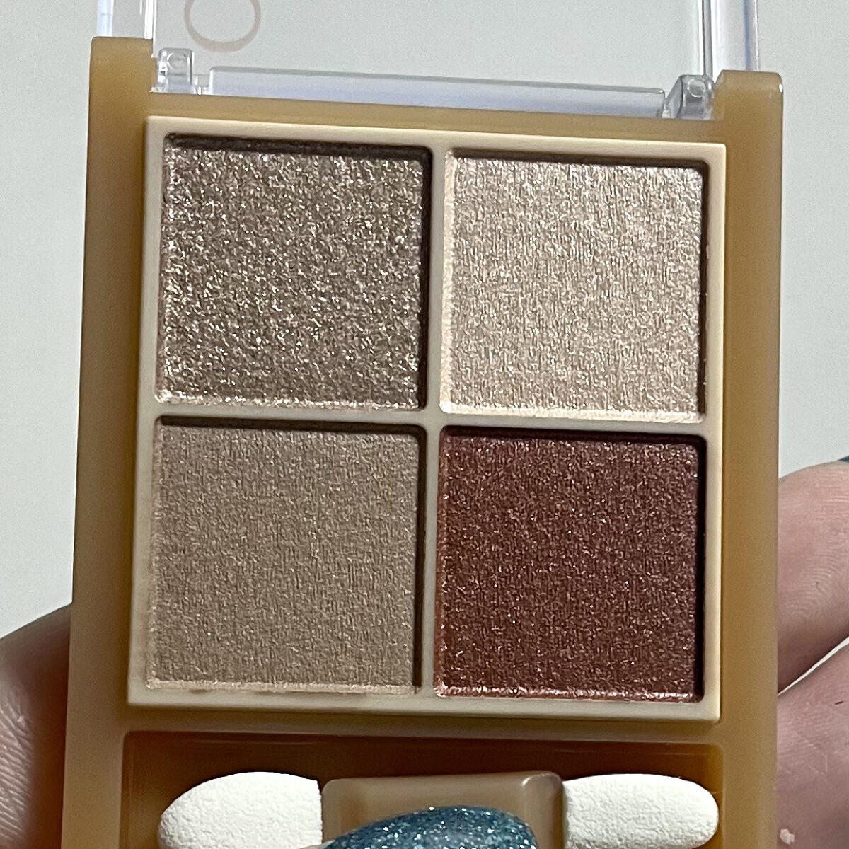 - ラメ・パール・マット3質感の4色アイシャドウ。 肌馴染みの良いベージュを基調としたカラー。ラメ・パール・マットの3質感を重ねて、自然にまぶたを強調し奥行のある大きな目元へ。 しっとり溶け込むような柔らかなパウダーなので、スルスル伸びてまぶたにピタッと密着。保湿成分(スクワラン・ホホバ種子油)配合。
