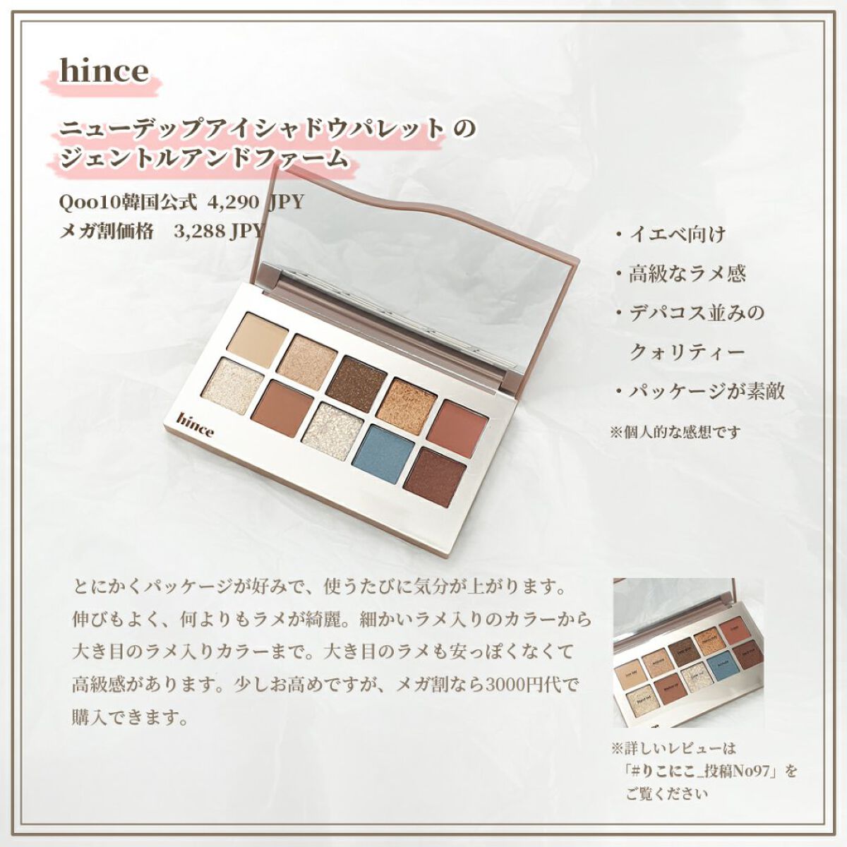 デパコス並みの高級感が溢れるラメ✨ ラメ好きさんにはおすすめ!安っぽくない高級感のあるラメ感のアイシャドウ✨ラメも細かいものから大きいものまで。 hinceと言えば、パッケージ。外箱から本品までパッケージがとても素敵で気分が上がります 値段が少しお高めですが、Qoo10のメガ割のときには20%割引になるので、狙っている人はこの機会に!