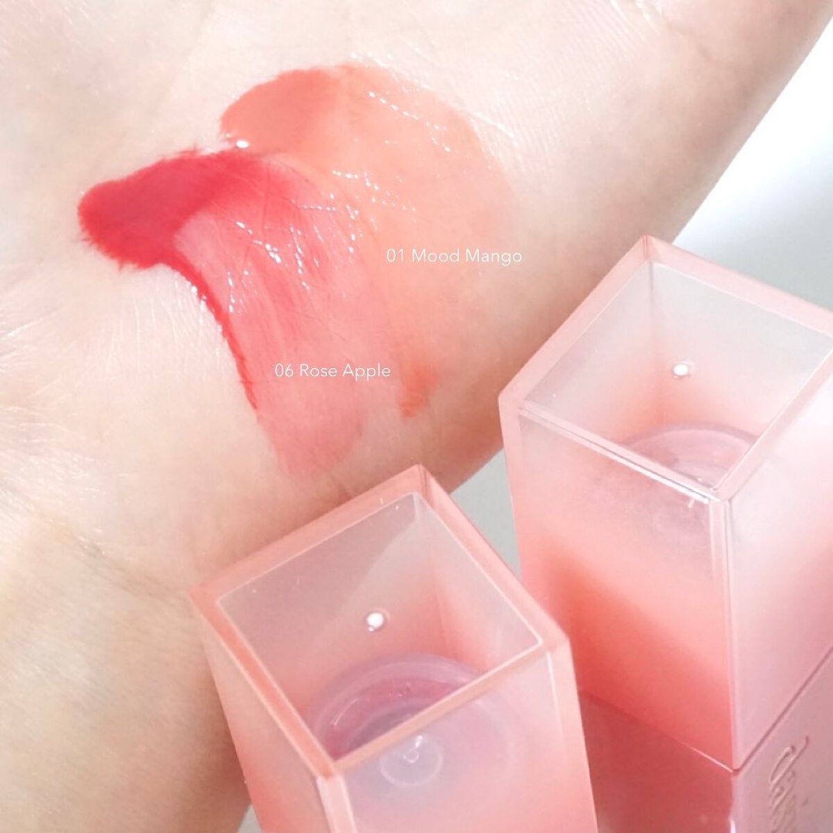 キラッとした濡れツヤ感のある仕上がりで、角度を変えるとキラキラしてとても綺麗です🙏✨ ウォータリーにとろみも混じったテクスチャー。一度につく量が少量で、薄ーくしかつかないため唇に負担を感じません✨ 発色は1度塗りでもかなりきちんとカラーがついてくれます!重ねるほど発色もほんのりカラーの深みが出る印象です🙌 ティッシュオフしてみたところカラーの固定力は結構高いイメージでしたが、食事をするとほんのりと色味が残るかなといった印象です。 乾燥はしにくいですが、ベースにリップクリームなど何もぬらずにつけた時に若干の乾燥を感じたので、きちんと保湿してからつけるのがベストかと思います💡 二等辺三角形のやや平ためのアプリケーター。先端がとんがっていて唇のラインに当てやすいです🌟 りんごのヨーグルトみたいな爽やかで甘い香りがします🍎唇につけている瞬間は香りますが、生活している分には味がしたり気になることはありません🙌