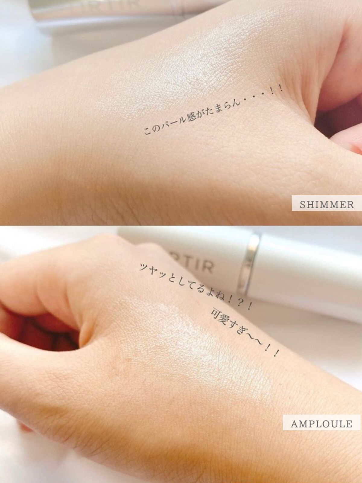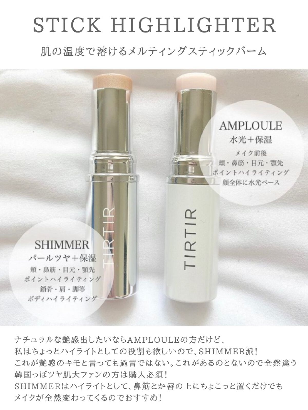 TIRTIRのハイライトさっいこうに可愛かったから聞いてくれ。 マジでツヤ感が果てしない。。。 あー韓国っぽメイクの艶感ってこれで出してたんですね。って思うアイテム 先日投稿したファンデーションとの相性も抜群なので、 本当にツヤメイク大好きっこちゃんはすぐにでも使って欲しい。 個人的にはパール入りのSHIMMERが好きだけど よりナチュラルさを求めるならAMPOULEのほうが良いかな。 でもハイライト効果をしっかり出していきたいなら断然SHIMMERが良いと思います! これですぐに、韓国っぽ艶肌なろ。
