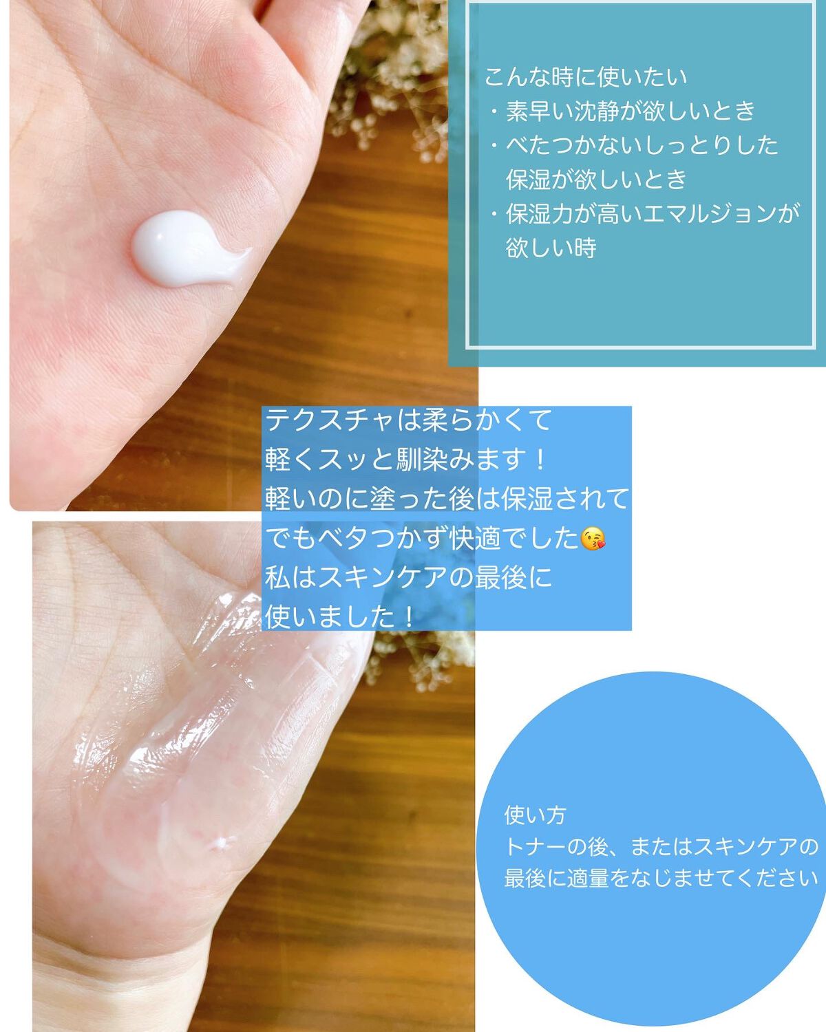 無色透明のサラサラなジェル状テクスチャ。 とっても瑞々しくて、さっぱり且つしっとりもちもちと保水してくれる感があります✨ 火照った肌の温度を下げてくれるのでお風呂上がりや暑い日、日に当たった後に使うと気持ちよくて◎ 白色のジェル状クリーム。 緩めのテクスチャで、こちらも非常に瑞々しい使用感👌 こちらはCICAのハーブ系の香りがして癒やされます🌿 もちろん鎮静効果も期待できて◎ どちらも肌馴染みが良く、スーっと肌に吸い込まれてもっちりしっとりと保水&保湿してくれて乾燥や炎症した肌を労ってくれます🥰