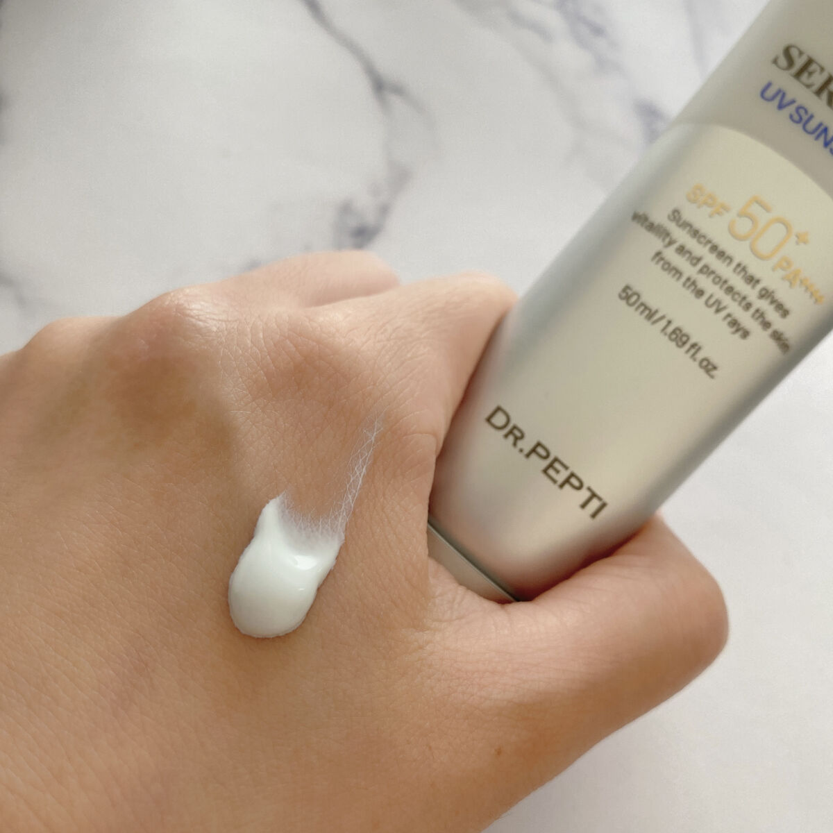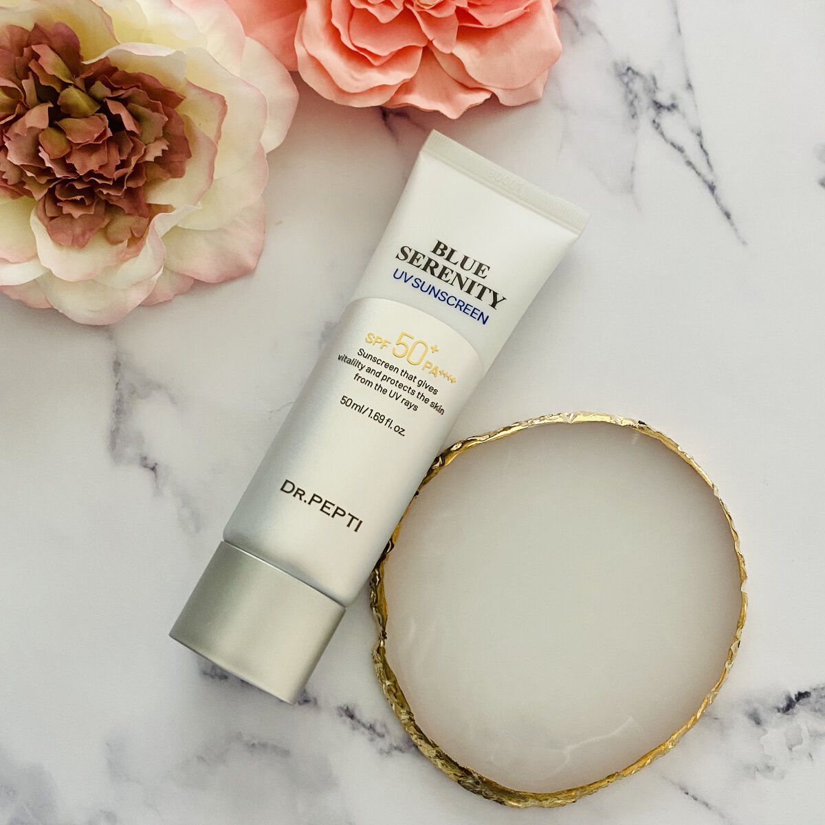 最初手に出してみた感じだと、「ノンケミカルの日焼け止め特有の白浮きがありそうだな。」と思ってみたのですが、そんな事はなく、自然にトーンアップして肌にツヤが出ます✨ 商品説明に乳液テクスチャーとの記載がありますが、硬めでクリーム寄り。ベタつきがないので下地として使用後、ファンデを塗ってもヨレはありませんでした👍 このブルーセレニティーUVサンスクリーンは使用感も良くて、グアイアズレンで肌を整えてくれる効果や、DR.PEPTIといえばのペプチドが配合されていてスキンケア効果もプラスしてくれるのが嬉しいです💕