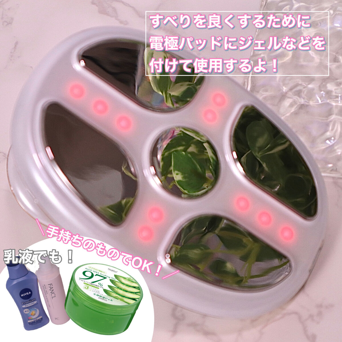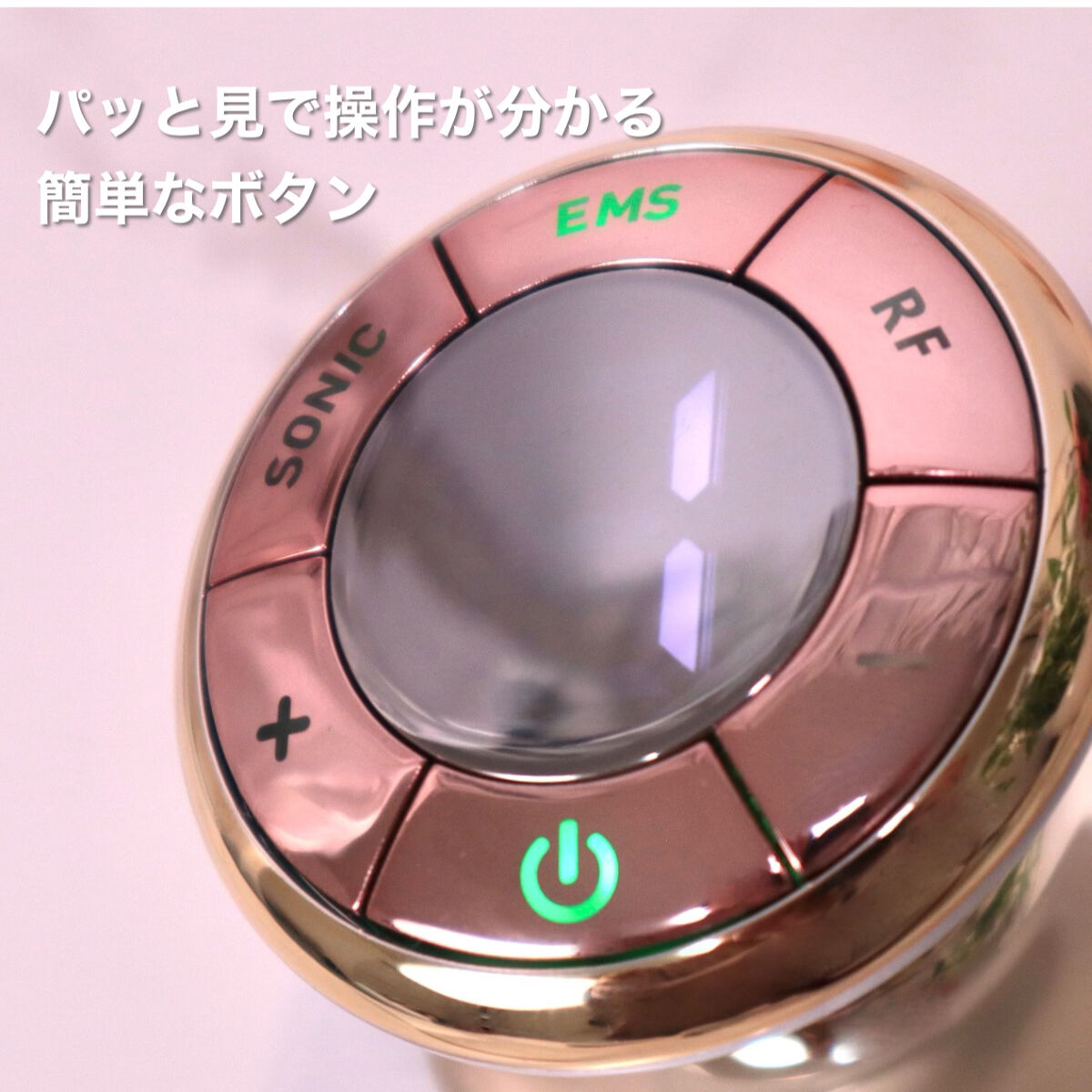EMS:微弱電流を流して、電極パッド中の 干渉波を通してお肌の感覚神経を刺激し、 筋肉の圧縮を促し運動と同じような効果が 得られます。 SONIC:超音波が当てられることにより 脂肪細胞が分解されます。 RF:高周波をあてることで皮内に直接 RFを送ることでコラーゲン生成を促進します。 光波:3つの波長の光を通してお肌のケア。 お肌を柔らかくする効果があります。