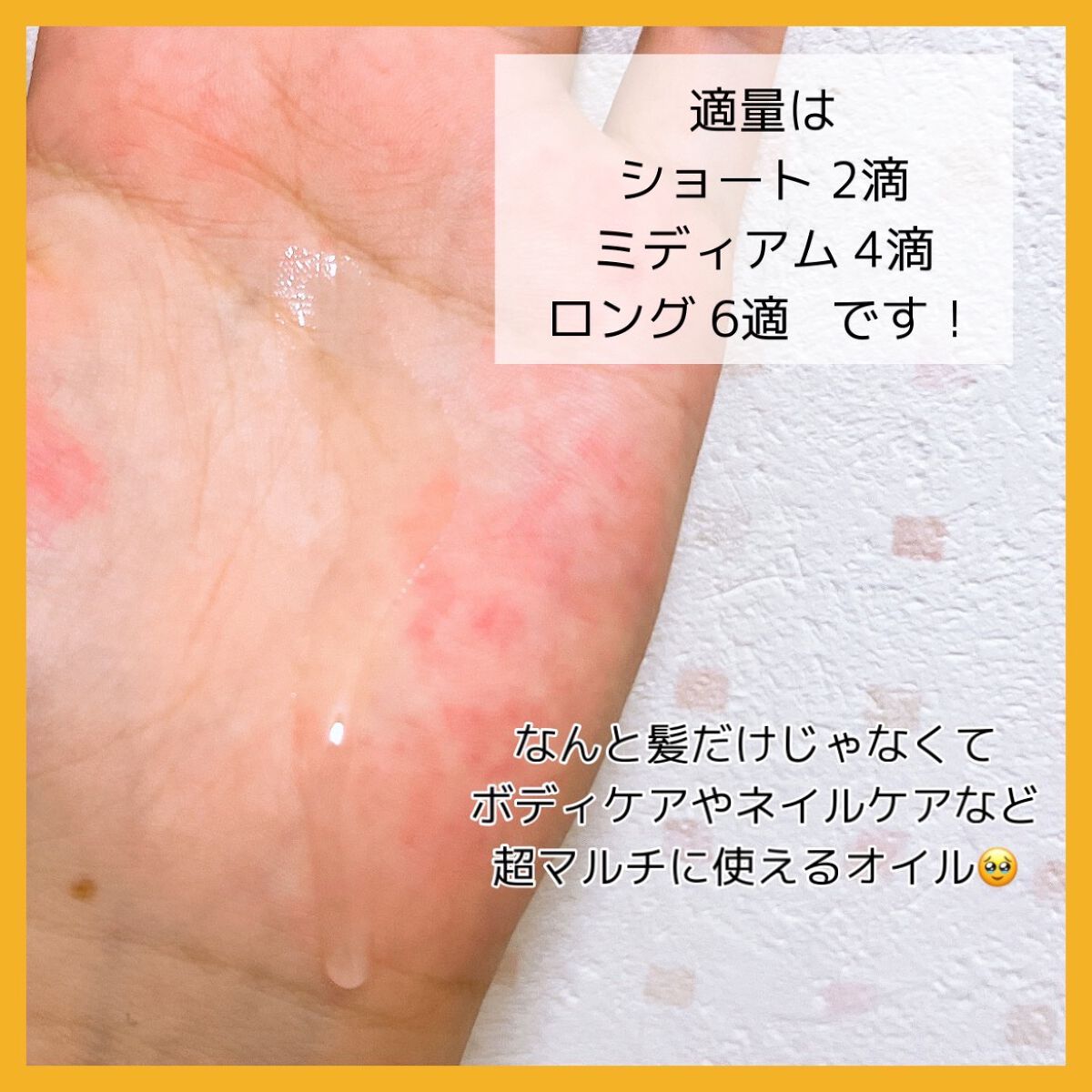 さらっとしすぎずとろっとしすぎずのテクスチャー。あんずの甘い香り。 夜つけて寝て、朝セットする時触り心地がいつもよりつやがあった。購入を前向きに検討したい。 100%植物由来の、無添加オイル。うるおい・ツヤを与える、クセ・広がりを抑える。