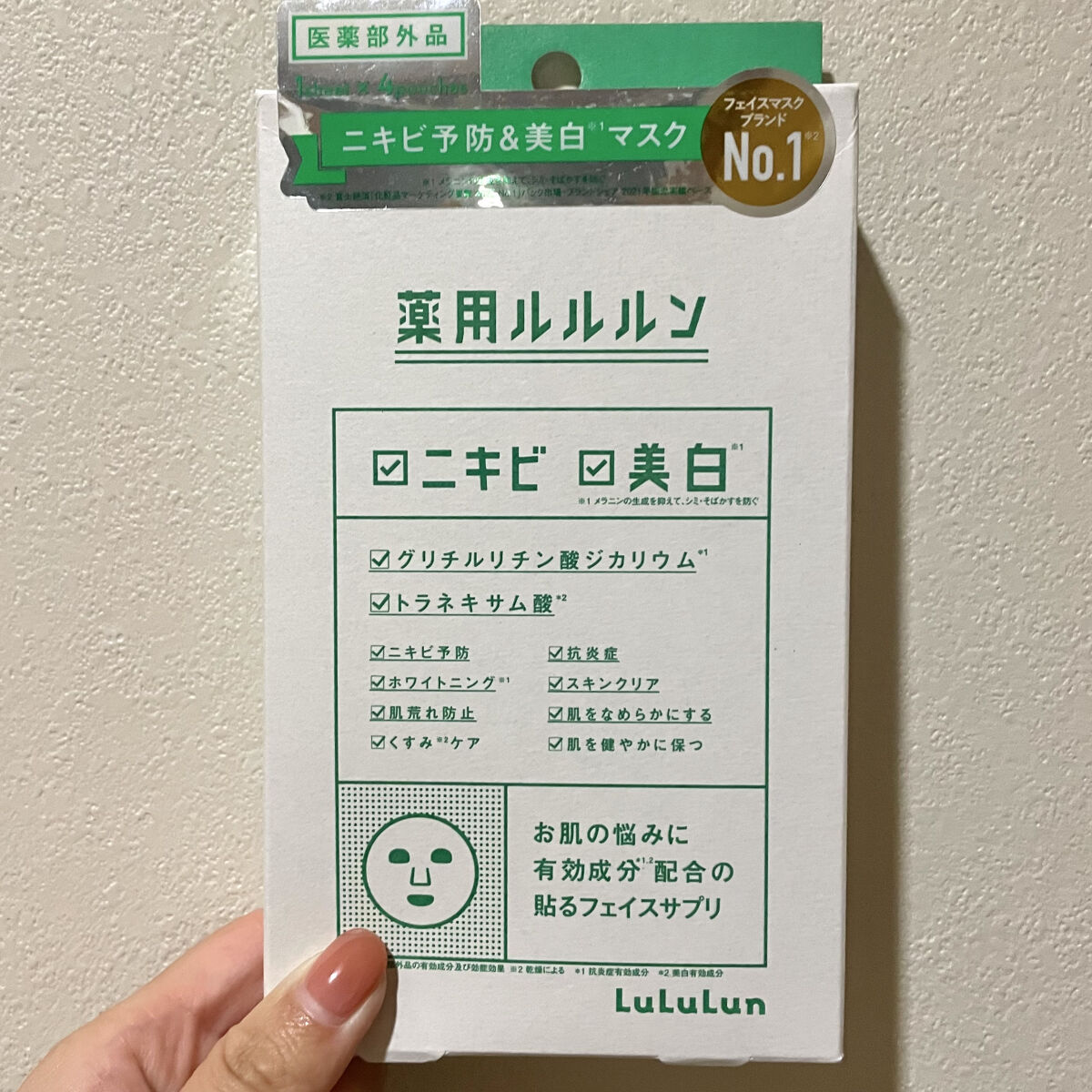 - 【医薬部外品】 ルルルン初の医薬部外品、「薬用ルルルン」が登場。 「薬用ルルルン 美白アクネ」はニキビを予防したい方、美白※1・くすみ※2をケアしたい方におすすめ。 (※1 メラニンの生成を抑えて、シミ・そばかすを防ぐ ※2乾燥による)