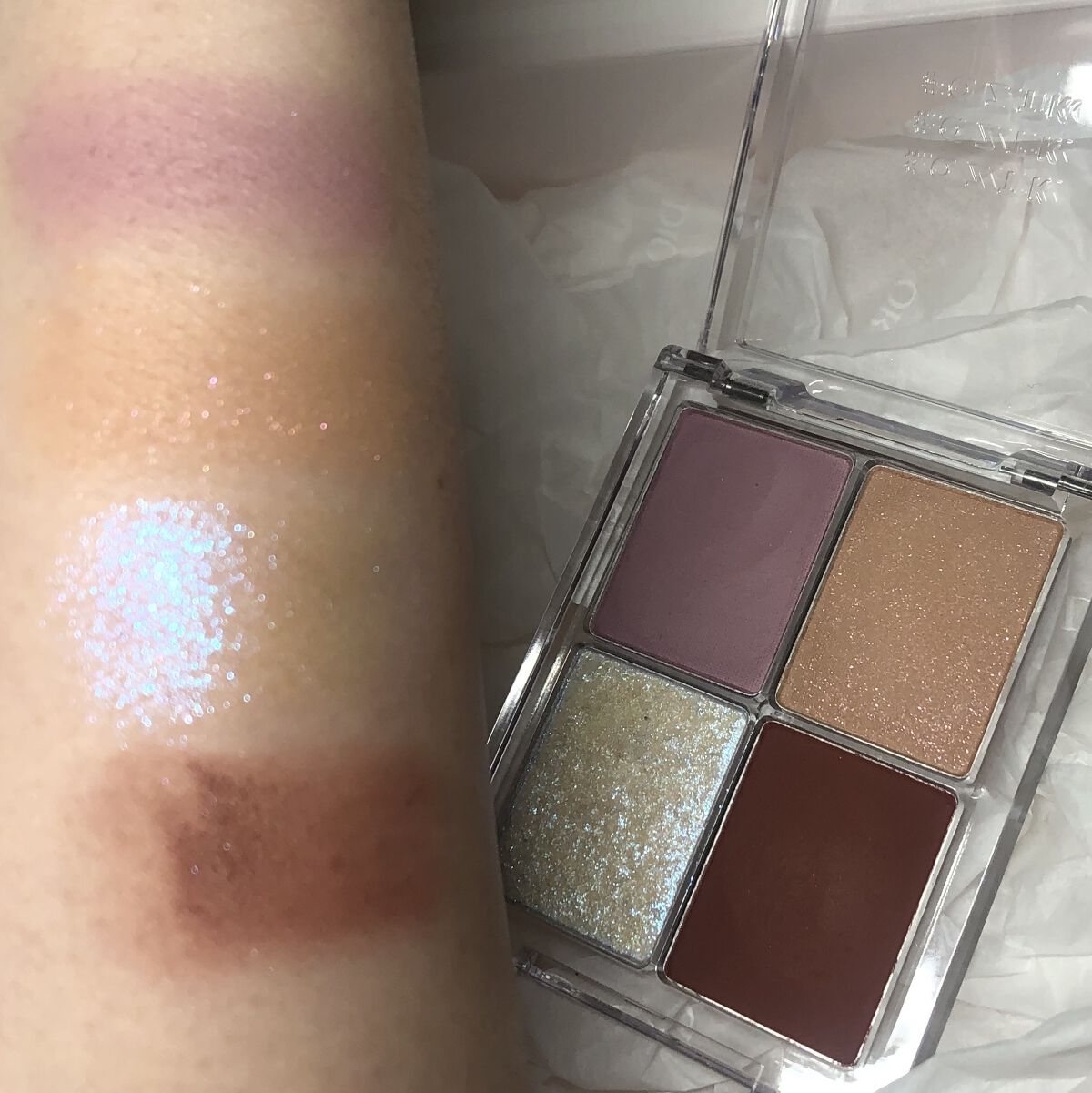 バームハイライトも入っている パレット珍しいですよね🫣 1番濃ゆい茶色のカラーで アイライン用カラーだなと思っていたのですが かなり淡い発色で、あかりんが アイホールに先に塗って使っていたのが 大正解なカラーでした!可愛い。 ラメ感もギラギラで可愛い。