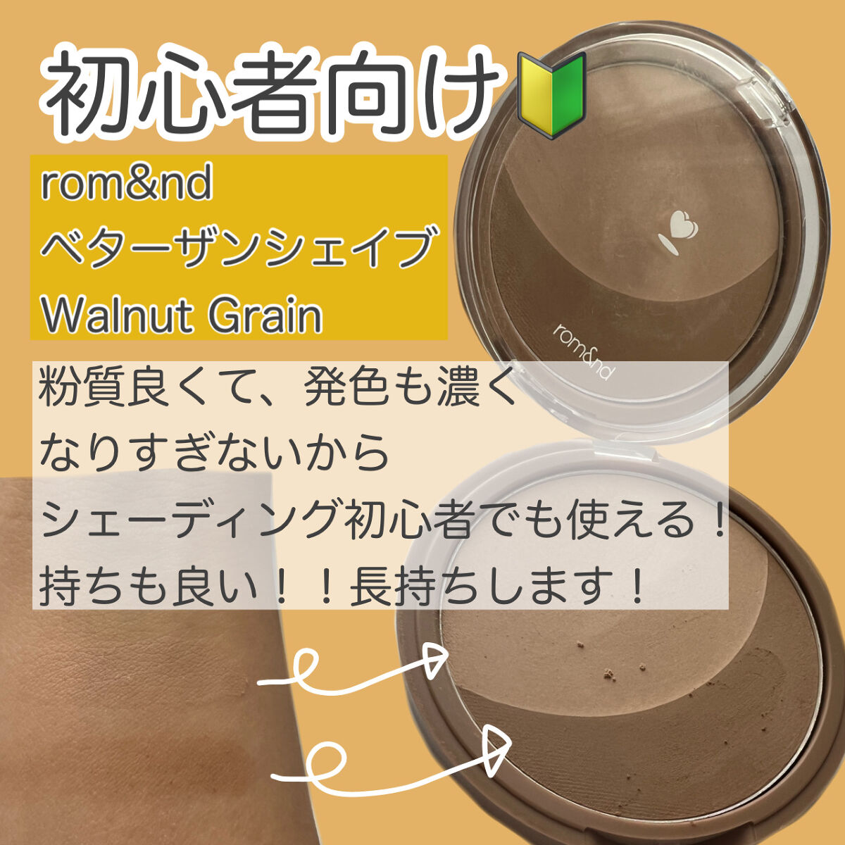 🧸rom&nd#ベターザンシェイプ01オートグレーン淡いカラーと濃いカラー2色のシェーディング01はブルベ向けで、黄味がないグレーがかったブラウン馴染ませやすくとても使いやすいです!自然な発色にしたい場合は、濃い色→淡い色に向かってブラシをい...