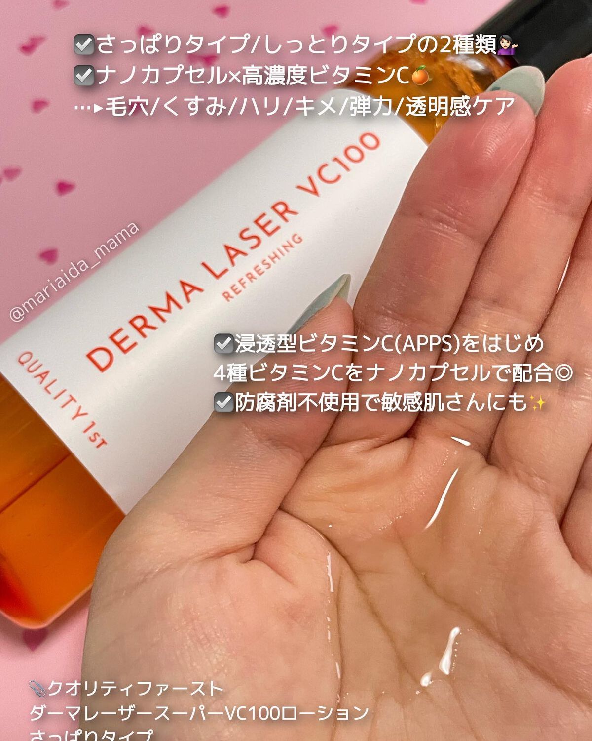 大人気ダーマレーザーの毛穴ケア化粧水✨ 私は今まで「さっぱりタイプ」の方を何度かリピートしていたのですが、 ナイアシンアミドとグリセリンの配合量だけが違うようです💡 クオリティファーストこだわりのビタミンCの配合方法で、さらに防腐剤を使っていないところも嬉しいポイント✨