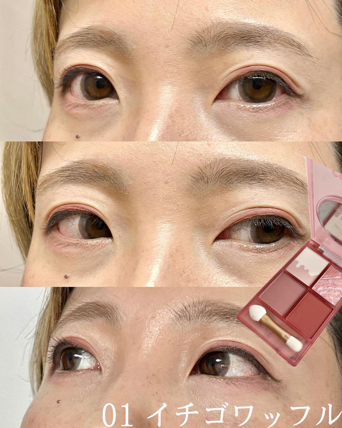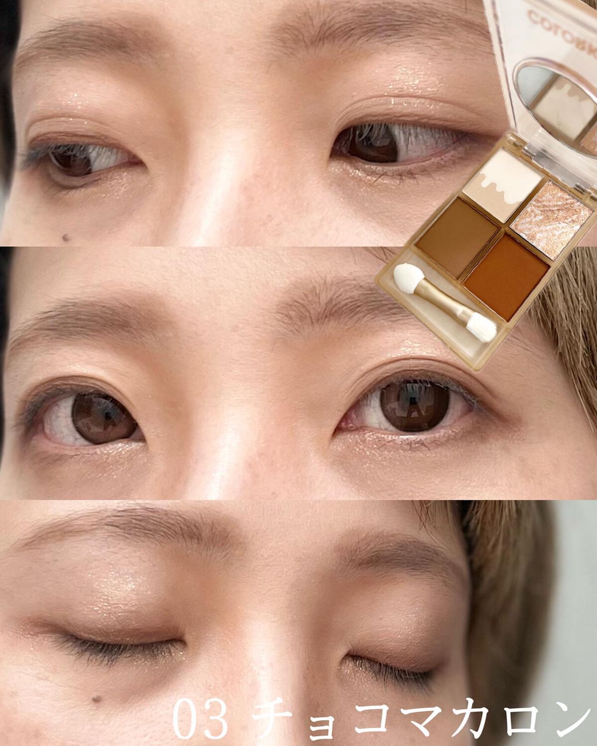 捨て色なしでこのパレット一つで目元が完成👁 見たまま発色で粉とびもなくて、密着力も高いのか、ヨレない🙆♀️ まさにドライアップル🍎を思わせる秋らしい配色、イエベさん向きかな? この大きさと使いやすい4色っていうのがいいね😁 メイク初心者でもまとまりのある目元ができるよ🙋♀️