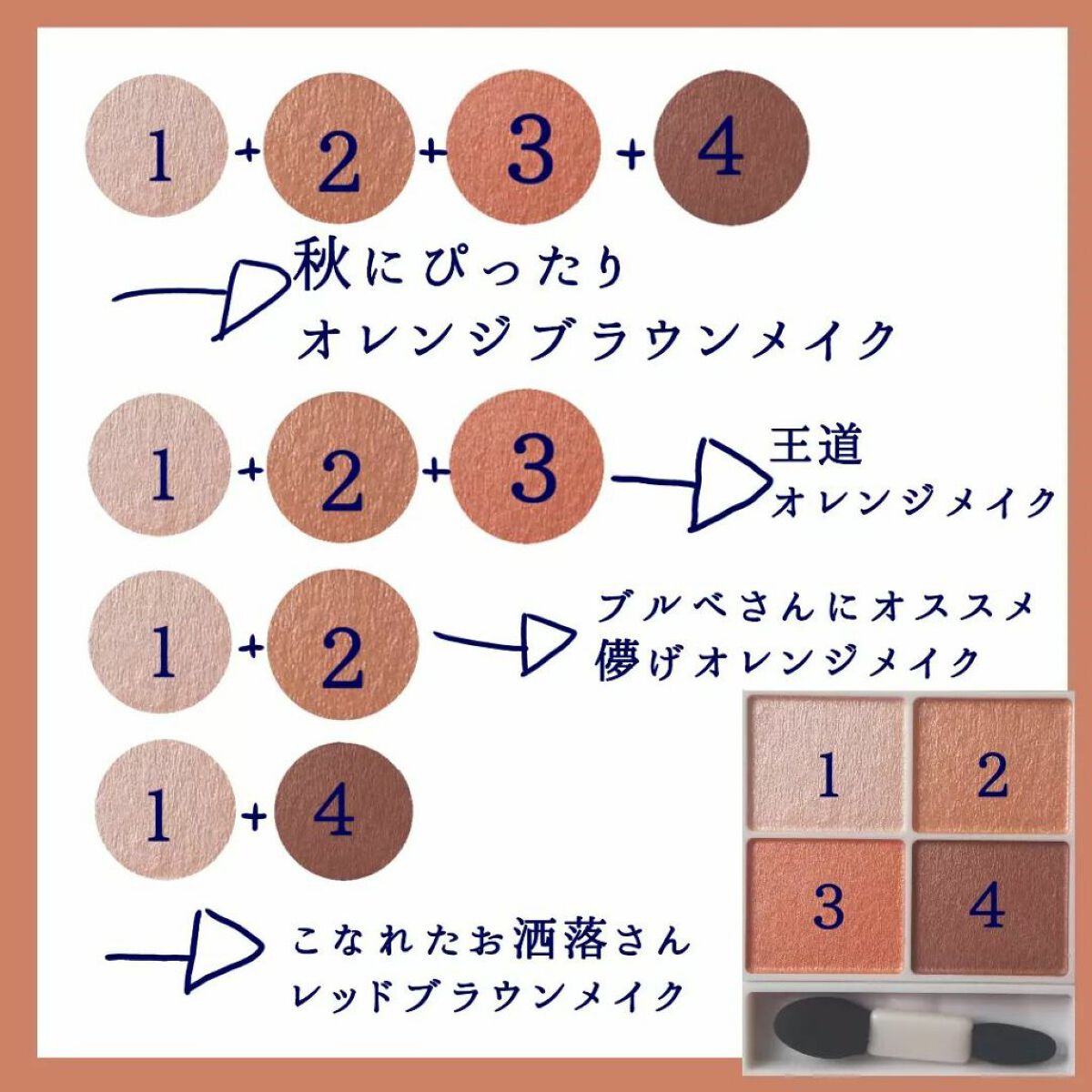 オレンジを避けていたブルベの私が最近めちゃめちゃハマってるオレンジシャドウです!ブルベさんにこのアイシャドウがおすすめの4つの理由1.オレンジが主張しすぎないシアーな発色だから2.ラメが入っていて肌をくすませないから3.バランスを取れる色が入...