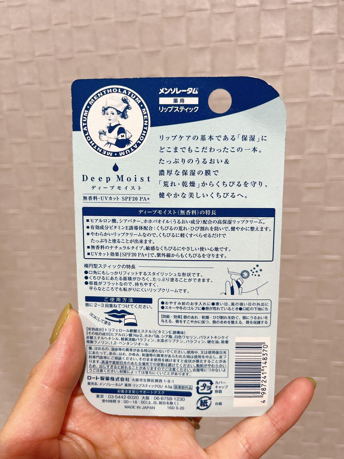 。.ꕤ‿メンソレータムディープモイスト無香料‿ꕤ.。楕円形のリップクリームです。唇からはみだしにくく、口角までフィットするリップだそうですが、わたしは塗りづらかったです🥲コロコロ転がらないのは良いです◎スルスルサラサラとした塗り心地で、100...