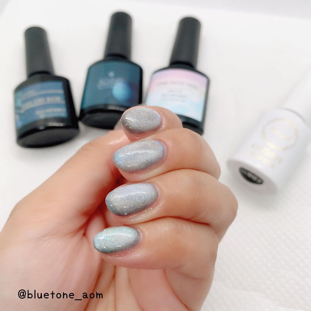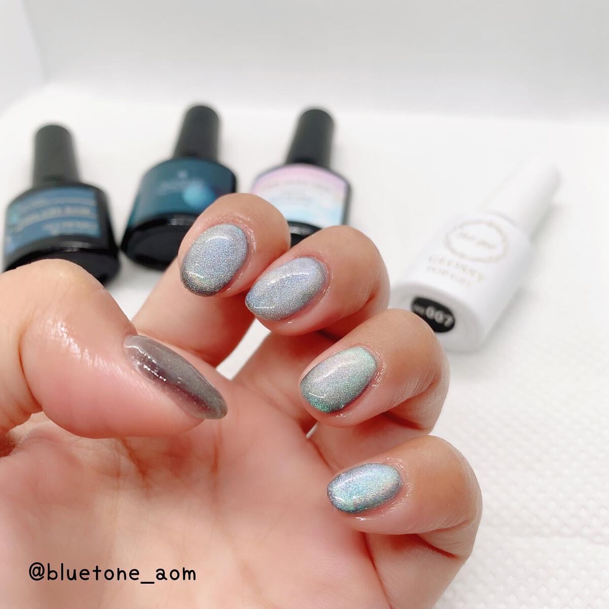 ラメがしっかりしてるし クリアカラーが入ってるから オーロラパウダー無しでも 充分キラキラしました! 反射強めのフィルムなので 実物はもっと うるうるとキラキラが強いです! ビー玉みたい🥺 ネイルシール長持ちさせたいけど ちょっと飽きてきたな〜って時とかに 全然違った印象になるのでオススメです! Seriaのベースジェル 本当にうるうるネイルしやすいので オススメしたい🙆♀️