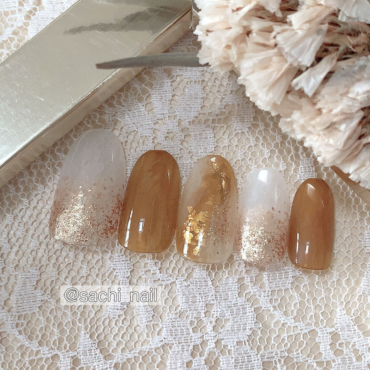 ワンカラーでも指ごとに色を変えるだけでオシャレに見えます💕 画像のようにゴールドラインとストーンを少し足すだけで華やかさがアップ🥰 何度かご紹介したことのあるスポンジで作るグラデーションです✨ スポンジを使うことで境目が綺麗に馴染んでくれます💕 アルミホイルの上でブラウンとトップコートを1:1くらいで混ぜたものを、トップコートのハケに取って3箇所に塗るだけ👌 事前に混ぜたものを塗ることで、爪の上でぼかすより簡単に出来ます💕 ベースカラーが乾く前に点置きしてぼかすことで綺麗にぼかせます✨ スピードが大事なので、使うポリッシュのキャップは全て開けておきましょう😊 天然石のラインはガタガタの方がより天然石っぽく見えるので、ラインを描くのが苦手な方でも大丈夫🙆♀️ 難しそうに見えて、やってみると意外と簡単に出来ます♡