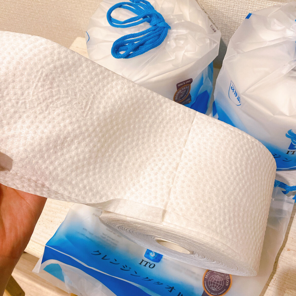 使い捨てクレンジングタオル ¥657 洗顔後の顔拭きやメイクの拭き取り、お肌のお手入れにとても便利! 使い捨てタイプで常に清潔。蒸気高温による滅菌処理を行っているため清潔に使えます! こちらに変えて肌質が少し変わったような気がしていて、荒れも心無しか落ち着いたような気がしています☀️