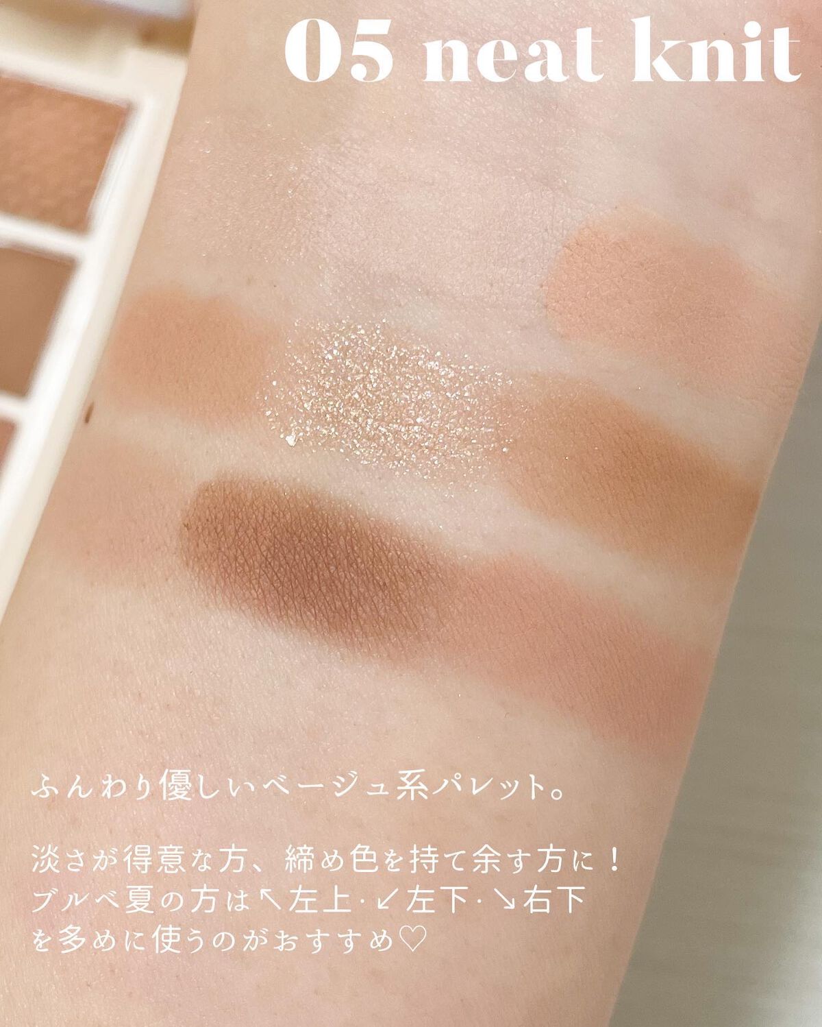 - <05 ニートニット> 〈Oat-A〉タルク、合成フルオロフロゴパイト、窒化ホウ素、リンゴ酸ジイソステアリル、ミリスチン酸Mg、シ リカ、 ナイロン-12、 トリ(カプリル酸/カプリン酸)グリセリル、 メチルプロパンジオール、 マカデミア種子油、 ジ メチコン、ステアリン酸Mg、プロパンジオール、ラウロイルリシン、ヒドロキシプロピルビスパルミタミドMEA、ス テアリン酸ジメチコノール、トリエトキシカプリリルシラン、水酸化Al、メチコン、カオリン、水、香料、マイカ、酸化チ タン、酸化鉄、マンガンバイオレット、グンジョウ 〈Zero-B〉タルク、ナイロン-12、窒化ホウ素、ミリスチン酸Mg、 シリカ、 ジエチルヘキサン酸ネオペンチルグリコール、 フェニルトリメチコン、 メチルプロパンジオール、 ヘキサ(ヒ ドロキシステアリン酸/ステアリン酸/ロジン酸)ジペンタエリスリチル、 リンゴ酸ジイソステアリル、 ネオペンタン 酸イソステアリル、 ステアロイルオキシステアリン酸オクチルドデシル、 ステアリン酸Mg、 プロパンジオール、 ジメ チコン、ポリブテン、水添レシチン、 トリエトキシカプリリルシラン、水酸化Al、ラウロイルリシン、カオリン、水、香 料、マイカ、酸化チタン、酸化鉄、マンガンバイオレット、グンジョウ 〈Neat-C〉タルク、窒化ホウ素、シリカ、ステア ロイルオキシステアリン酸オクチルドデシル、フェニルトリメチコン、ジメチコン、ミリスチン酸Mg、ナイロン-12、 メチルプロパンジオール、 ヘキサ(ヒドロキシステアリン酸/ステアリン酸/ロジン酸)ジペンタエリスリチル、 マカ デミア種子油、 リンゴ酸ジイソステアリル、 水酸化Al、 プロパンジオール、 トリエトキシカプリリルシラン、 ステアリ ン酸Mg、ラウロイルリシン、サラソウジュ種子脂、水、カオリン、香料、マイカ、酸化チタン、酸化鉄、マンガンバイオ レット 〈Nougat-D〉タルク、合成フルオロフロゴパイト、シリカ、トリ(カプリル酸/カプリン酸)グリセリル、ミリス チン酸Mg、ステアリン酸Mg、マカデミア種子油、ジメチコン、メチルプロパンジオール、トリエトキシカプリリルシ ラン、ジミリスチン酸Al、プロパンジオール、カオリン、水酸化Al、マルトデキストリン、水、香料、マイカ、酸化鉄、 マンガンバイオレット、酸化チタン、グンジョウ、カルミン 〈Knot-E〉水、ホウケイ酸(Ca/Na)、合成フルオロフロ ゴパイト、ホウケイ酸(Ca/チタン)、ホウケイ酸(Ca/Al)、ジメチコン、ステアロイルオキシステアリン酸オクチル ドデシル、リンゴ酸ジイソステアリル、グリセリン、ミリスチン酸Mg、パルミチン酸イソプロピル、シリカ、オクテニ ルコハク酸デンプンAl、ステアリン酸Mg、ペンチレングリコール、ポリソルベート20、トリエトキシカプリリルシラ ン、 (アクリルアミド/アクリロイルジメチルタウリンNa)コポリマー、 酸化スズ、 ケイ酸(Al/Mg)、 オリーブ油脂 肪酸ソルビタン、ステアリン酸ソルビタン、イソヘキサデカン、フェノキシエタノール、ソルビン酸K、エチルヘキシル グリセリン、デヒドロ酢酸Na、ポリソルベート80、オレイン酸ソルビタン、トコフェロール、マイカ、酸化チタン、酸 化鉄 〈Cashew-F〉タルク、窒化ホウ素、ナイロン-12、ジエチルヘキサン酸ネオペンチルグリコール、シリカ、フェ ニルトリメチコン、ミリスチン酸Mg、メチルプロパンジオール、リンゴ酸ジイソステアリル、ヘキサ(ヒドロキシステ アリン酸/ステアリン酸/ロジン酸)ジペンタエリスリチル、 ネオペンタン酸イソステアリル、 ステアロイルオキシス テアリン酸オクチルドデシル、ステアリン酸Mg、プロパンジオール、ジメチコン、ポリブテン、水添レシチン、ラウロ イルリシン、水酸化Al、メチコン、トリエトキシカプリリルシラン、カオリン、水、香料、マイカ、酸化チタン、酸化鉄、マンガンバイオレット 〈Crochet-G〉タルク、窒化ホウ素、リンゴ酸 ジイソステアリル、ナイロン-12、シリカ、ミリスチン酸Mg、トリ(カプリル酸/カプリン酸)グリセリル、ステアリン酸Mg、メチルプロパンジオール、ステアリン酸ジメチコノール、 プロパンジオール、ジメチコン、ラウロイルリシン、ヒドロキシプロピルビスパルミタミドMEA、トリエトキシカプリリルシラン、カオリン、水酸化Al、メチコン、水、香料、マイカ、酸化 鉄、酸化チタン、マンガンバイオレット、グンジョウ 〈Button-H〉タルク、シリカ、リンゴ酸ジイソステアリル、窒化ホウ素、ナイロン-12、ミリスチン酸Mg、トリ(カプリル酸/カプリ ン酸)グリセリル、ステアリン酸Mg、メチルプロパンジオール、マカデミア種子油、ジメチコン、プロパンジオール、ステアリン酸ジメチコノール、ラウロイルリシン、ヒドロキシプロ ピルビスパルミタミドMEA、カオリン、トリエトキシカプリリルシラン、水酸化Al、メチコン、マルトデキストリン、水、香料、マイカ、酸化鉄、マンガンバイオレット、酸化チタン、グン ジョウ、カルミン、黄4 〈Knitted-I〉タルク、シリカ、ステアロイルオキシステ