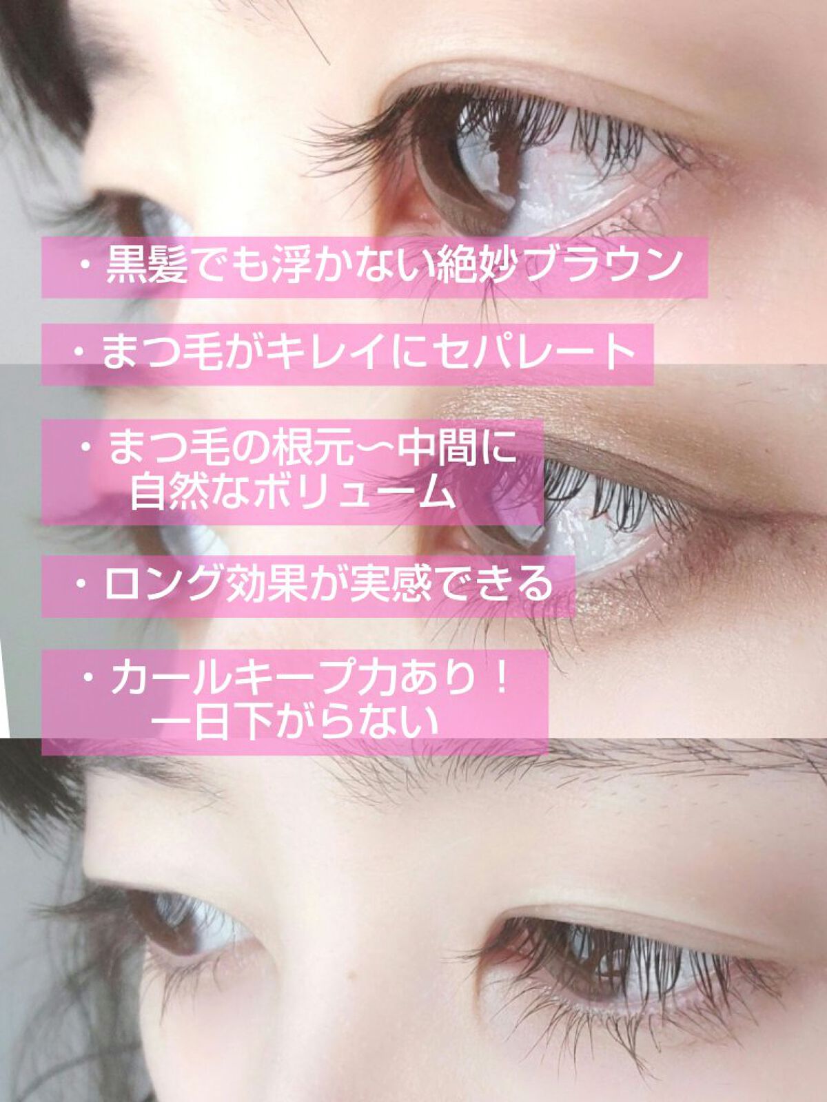 - カールキープ×セパレートの繊細な美まつげが、長時間ずっと続くマスカラです。 アジア人の目元に合わせたカーブブラシがまつ毛を隙間なくコーティングします。 また、豆・トウモロコシ・小麦由来の遊離アミノ酸複合物のフィトケラチン*とビオチン*がまつ毛を保護するとともに、重ねづけしてもダマになりにくく、ボリュームも演出して綺麗なまつ毛へと導きます。 *保湿成分 ※2025年3月12日〜パッケージリニューアル