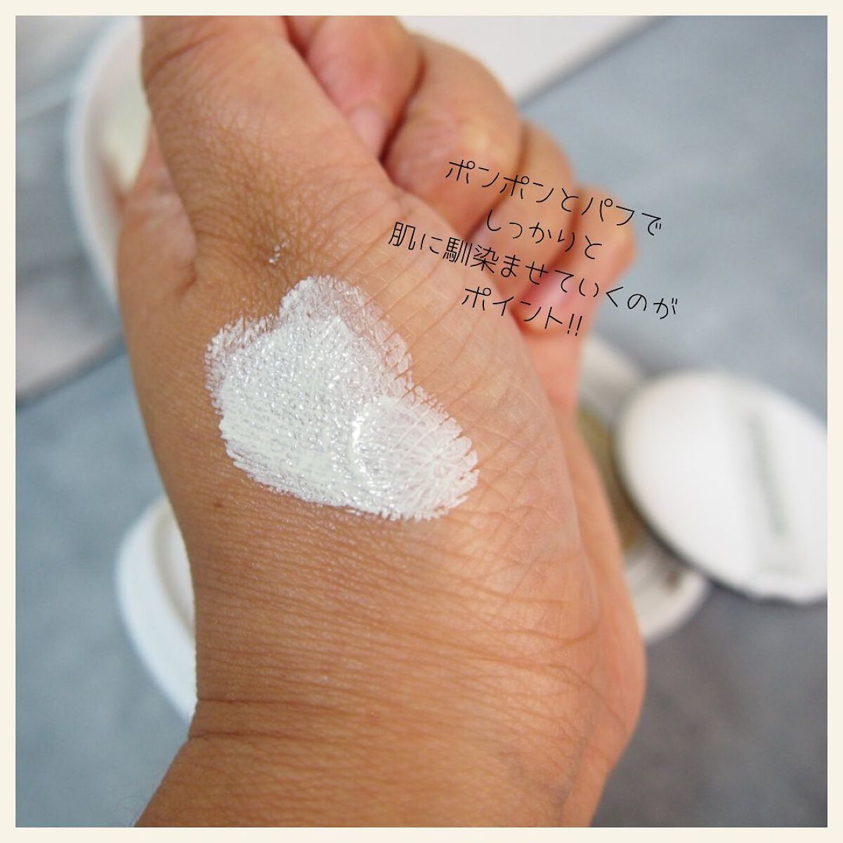 ミラーとしずく型のパフ付きで持ち運びにも便利。メイクの上から使えます😊 もち米由来の自然パウダーとカラーミングパウダーで紫外線で敏感になった肌の熱を落ち着かせてすべすべの仕上がりに。 ジュワッとみずみずしいテクスチャで肌に乗せるとややひんやり感あり。お肌もしっとり、明るく見えて小鼻の際の赤みもカバー✨