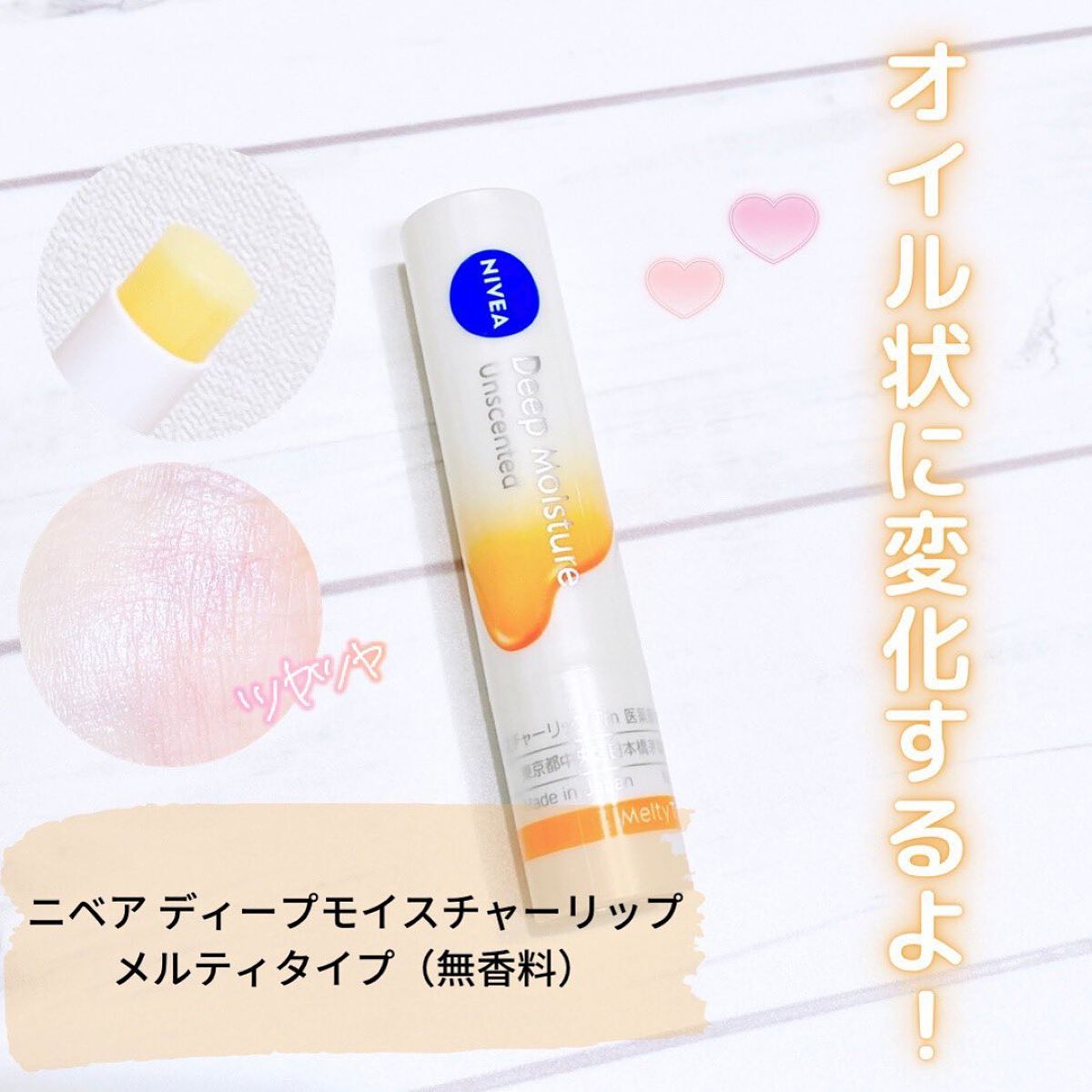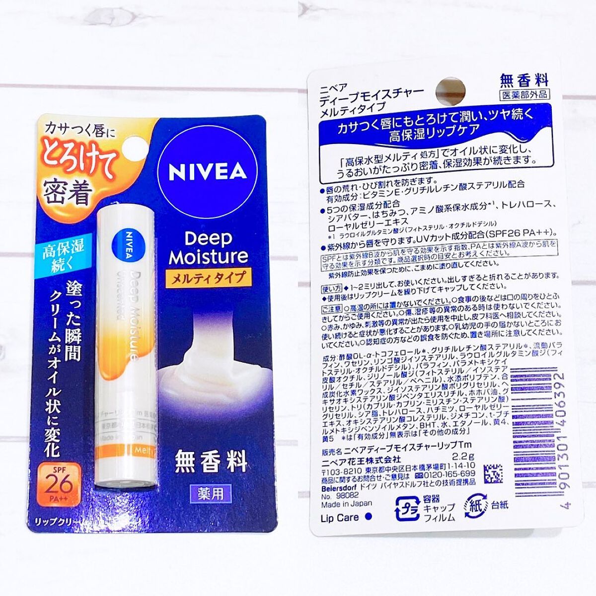 ブランド:NIVEAニベア品名:ディープモイスチャーリップ(メルティタイプ)香り:オリーブ&レモンの香り価格(税込み):660円・医薬部外品・UVカット成分配合SPF26PA++・5つの保湿成分配合・唇の荒れ防止成分配合唇の保湿にはかかせない...