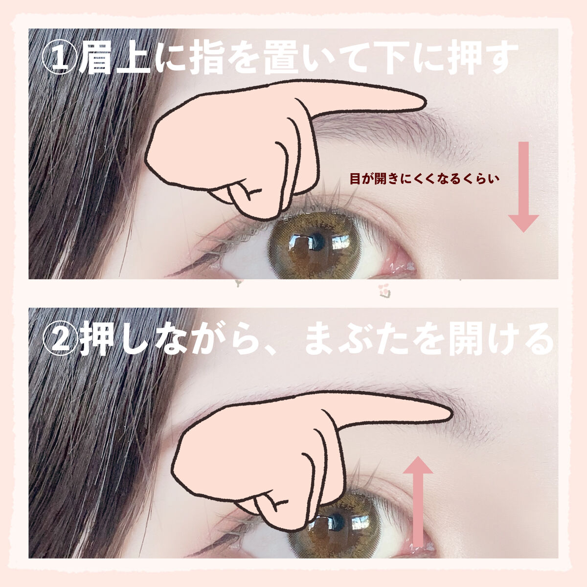 ・涙袋の影の部分まで、ベースを塗ることで縦幅がかなり強調されて丸目にみえる! ・アイシャドウの陰影とラメのハイライト効果で奥まった目に光を取り込んで出目っぽくみせる! ・淡いピンクのアイシャドウ、艶のようなラメ、細くて短いブラックアイラインが特徴 ・つり目を自然にいかせて、美人な雰囲気になれる! ・単色メイクは簡単そうに見えて難しいけど、ブラシを使うと綺麗なグラデーションになる! ・目の形によって中間色をどこまで入れるか変わるけど「目を開けた時に5mm見える」を基準にする