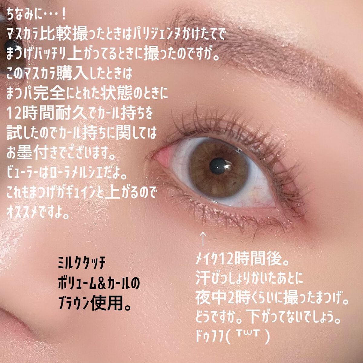 Milk Touch オールデイ ボリュームアンドカールマスカラです😌 細目のブラシで塗りやすく、ボリュームが出てカールアップもするなと思いました✨ 落ちにくいからちょっと落としにくさも感じました。 カールキープされる