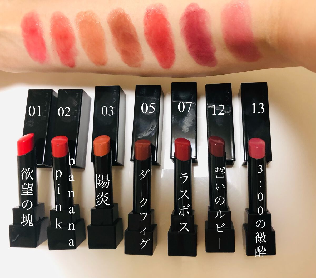 私のオススメは12誓いのルビーと 133:00AMの微酔です。どちらもくすみカラーとなっていて唇に付けた感じがたまらなくタイプでした。 新たに7色集まったので手持ちリップモンスターの紹介をさせて頂きました。