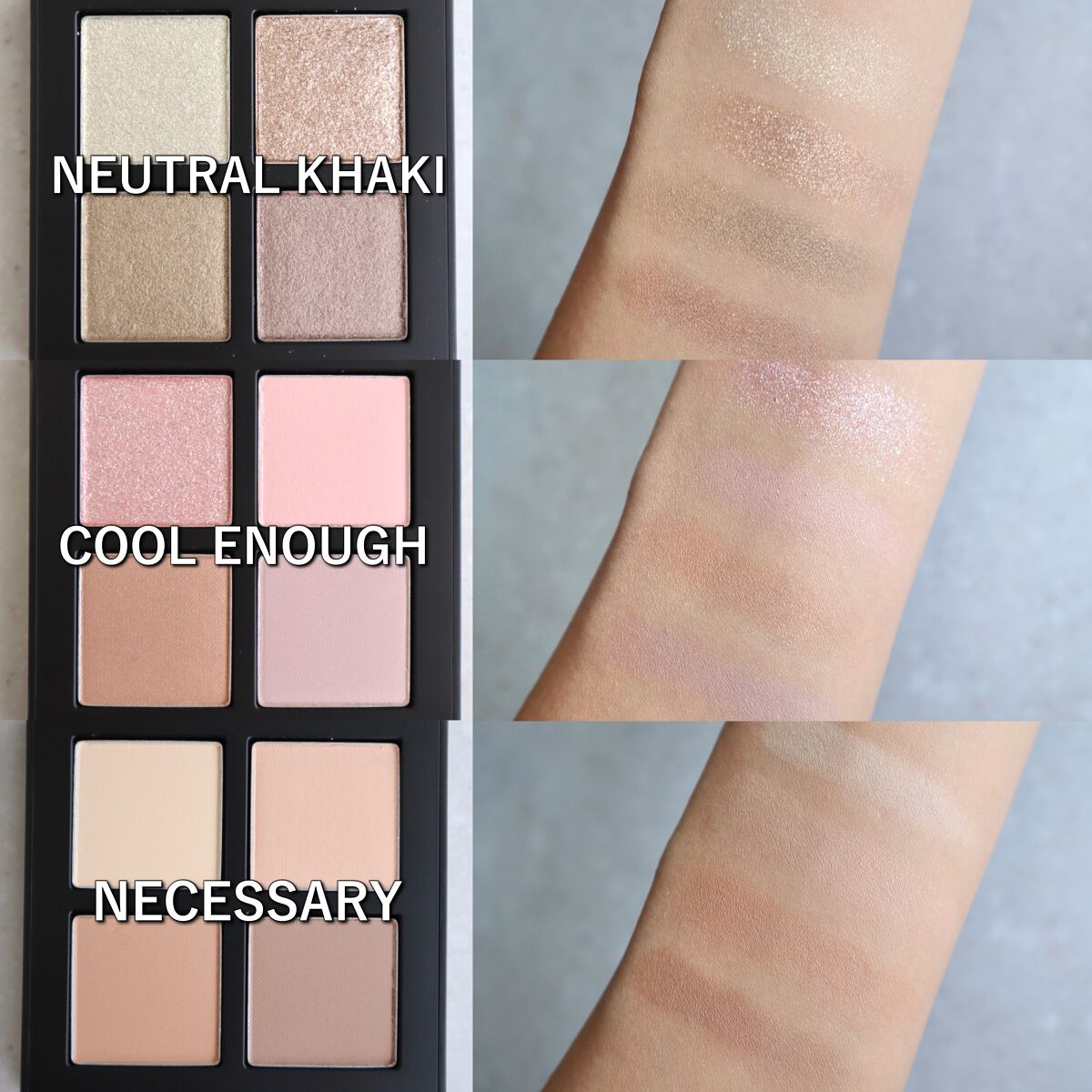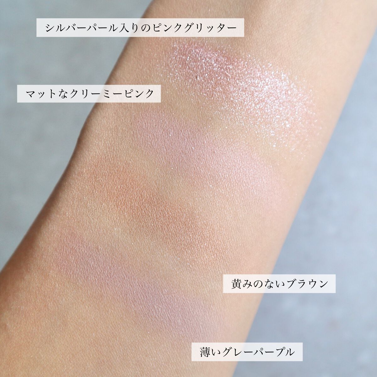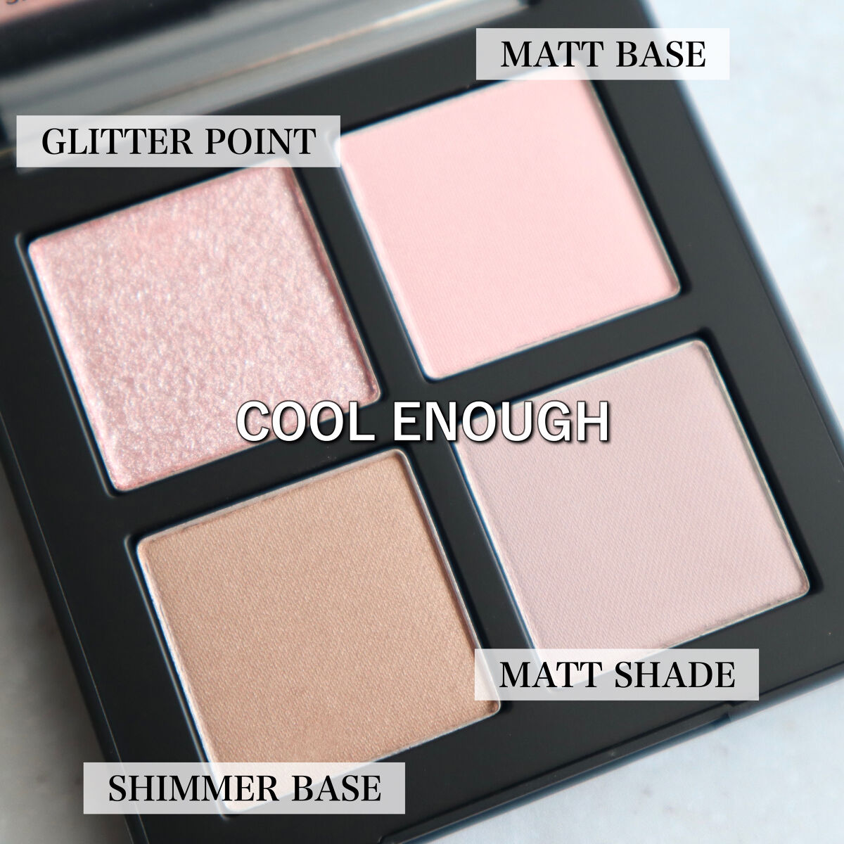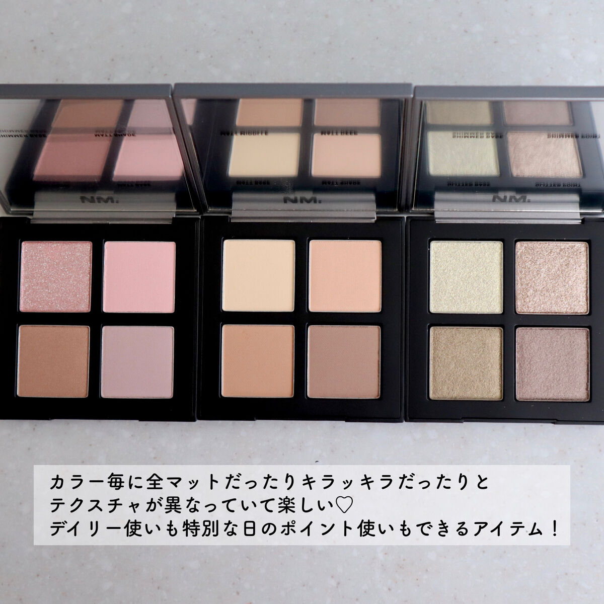 マットが7色、ラメ2色のどんな場面でも使いやすいパレット☕️🌹 一見ブルベ夏っぽいパレットですが、ニュートラルな色がバランスよく構成されていて比較的誰でも使いやすいと思います! かなりふんわりとした粉質で、ラメが他社のより取りやすかった✨ ラメ自体も自然かつ華やかな輝きで大好き💕 涙袋にもぴったりです! 正直何も文句ないパレットなので、おすすめです💓
