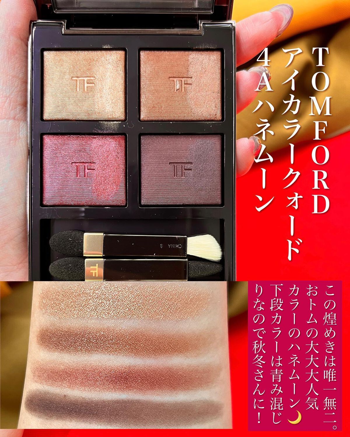 個人的にこれは絶対触ってほしい! のが「サスピション」で、大して触れてなくても肌に乗せたら「ジュワ〜…!」と発色してキラッキラン⭐️になります。 まるでこれはあれよ……ファラオ王。誰よりも権力持ってる気分になるからそんな気分の人にはガチで勧めたい🔥🔥 なんで沼る人が多いのか、一回触ったらすぐわかるのがトムフォードのアイカラークォード。是非、ボーナスが入った暁には試してみてくださいねえ〜!後悔無し!!