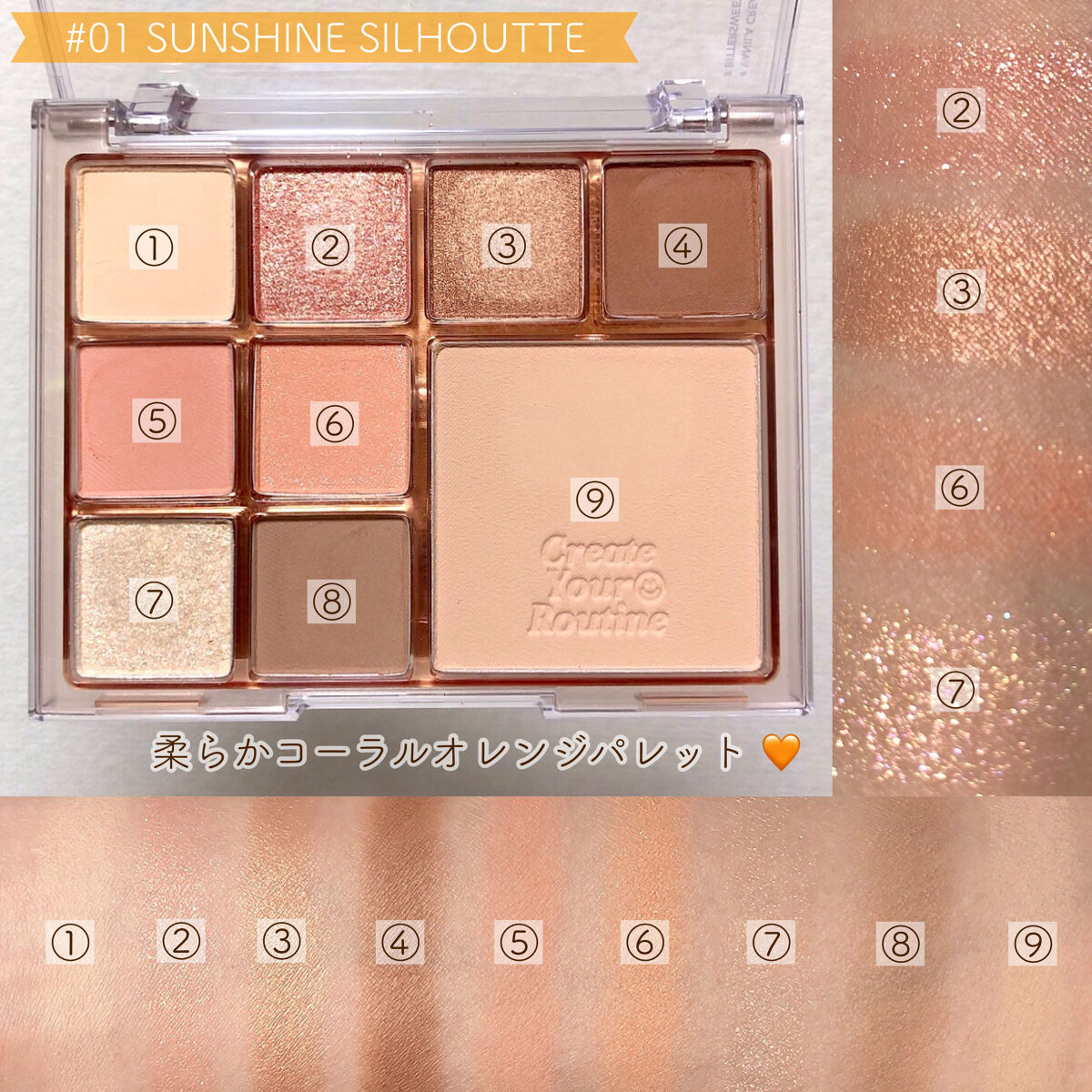 このアイシャドウパレット全体を通して言えることは、陰影の付けやすさを重要視して作られているのでとにかく陰影がつくりやすい! マットシャドウは高発色、高密着でとにかく粉質が良い。 ラメは上品なシマーからド派手な六角ホログラムまで、色々なテクスチャーが集まっているのでとにかく楽しい! ホログラムはブラシだとほぼつかないので、指でとってぬることをおすすめします。 テクスチャーはどれもワセリンを含んだかのようにしっとりとしているので、ラメ飛びせずまぶたにしっかりと密着!! 温かみのあるコーラルカラーが集まっており、イエベ春の私大歓喜😂 デイリーメイクからギラギラのパーティーメイクまで多彩に楽しめるブラウンパレット。 絶妙なローズピンクカラーが集まったお上品仕上がりなアイシャドウパレット。 彩度0なグレイッシュカラーが集まったマットシャドウパレット。 陰影が簡単に作れるまろやかなヌードブラウンが集まったアイシャドウパレット, 彩度低めの優しいミュートピンクカラーが集まったパレット💜