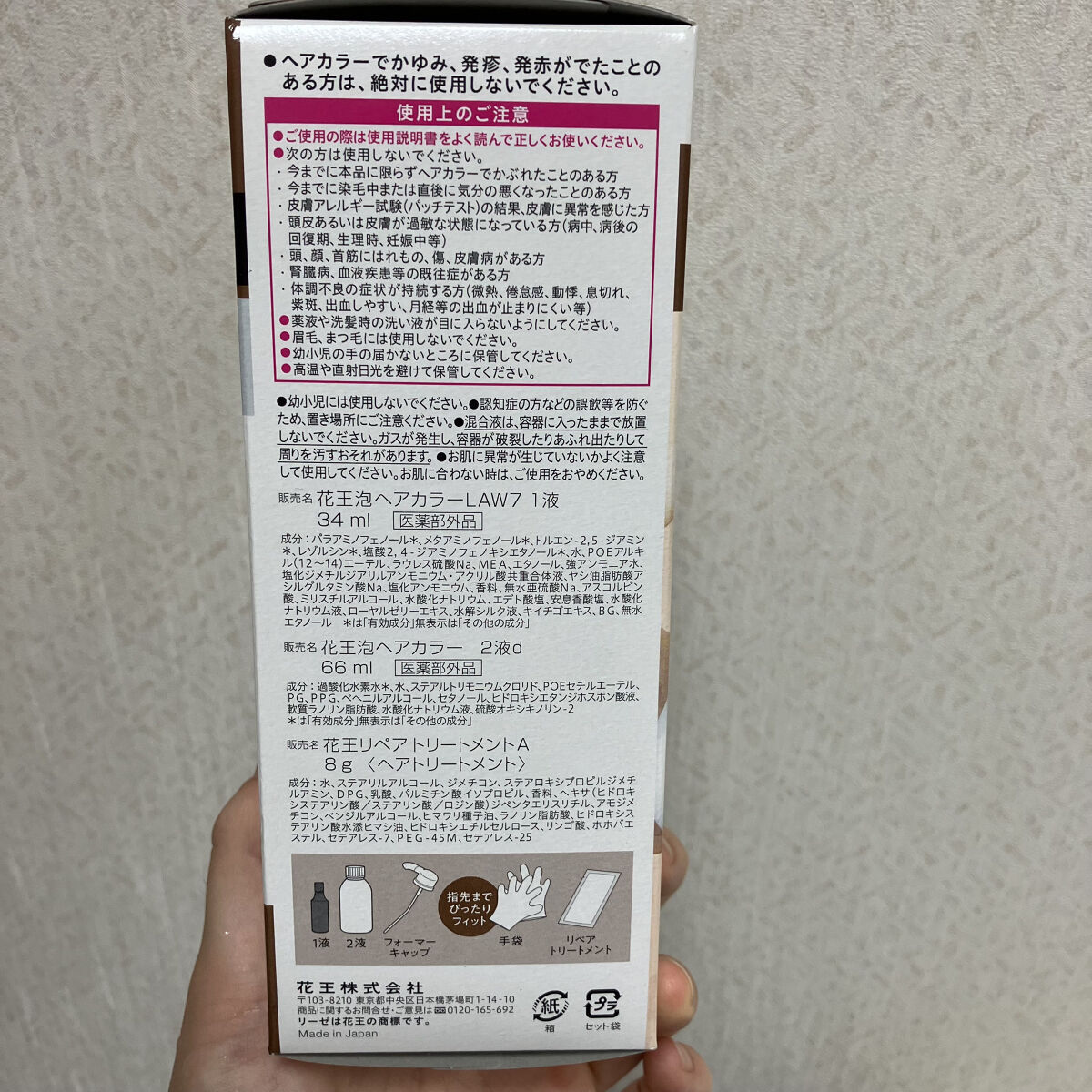 - 【医薬部外品】 【黒髪用ヘアカラー】 泡で簡単! 濃密泡が染まりにくい根元や見えない後ろにもしっかり密着して、ムラなく美しい仕上がりを実現。 透明感とやわらかさを表現するために、グレーやブルーの色味をブレンドした「サロン発想」の色設計。 毛髪保護成分*配合。指通りなめらか、しっとり質感の染め上がり。 *水解シルク液、軟質ラノリン脂肪酸 アフターカラー用リペアトリートメント(化粧品)つき。 ●セミロングヘア(肩から脇の下くらいの長さ)1回分 ●1回使いきりタイプ ●白髪用ではありません ※使用上の注意をよく読んで、正しくお使いください。 ※ヘアカラーでかゆみ、発疹、発赤がでたことのある方は、絶対に使用しないでください。