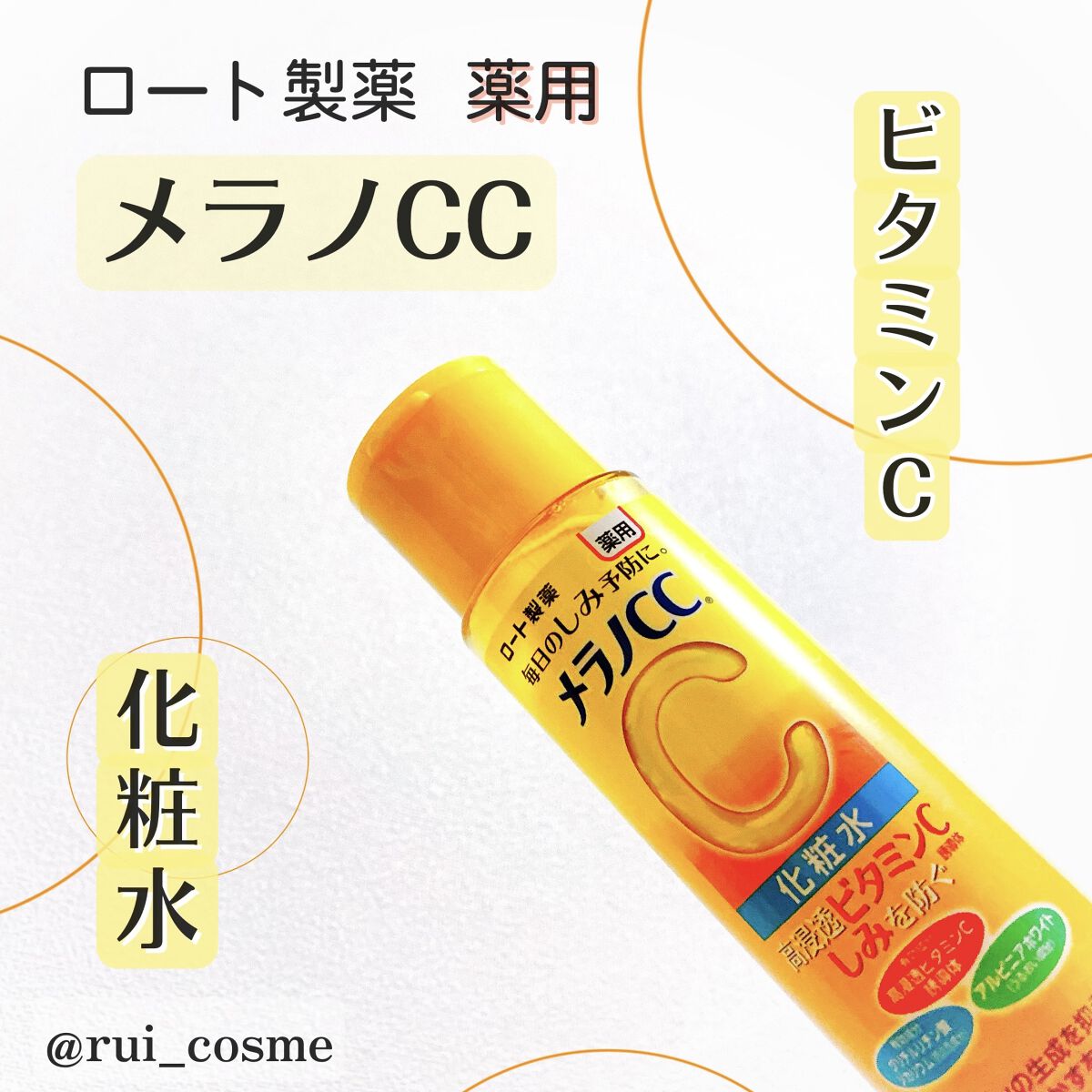 - 「メラノCC 薬用しみ対策 美白化粧水」は、顔全体にうるおいを与えながら、しみ対策できる薬用美白化粧水。 美白有効成分高浸透ビタミンC誘導体*1が角質層すみずみまで浸透し、メラニンの生成を抑え、しみ・そばかすを防ぎ、透明感のある肌へと導きます。 また、抗炎症成分*2と3種のうるおい成分*3を配合。ニキビ痕が気になる肌にもうるおいを与え、肌を整えます。 さわやかな柑橘系の香りです。 *1:3-O-エチルアスコルビン酸 *2:グリチルリチン酸ジカリウム *3:アルピニアホワイト、レモンエキス、グレープフルーツエキス