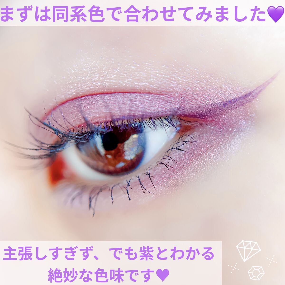 ベースに右上、目頭から黒目上に真ん中、黒目〜目尻に右下を、左上を目頭にくの字に塗ってもらいました✨ ピンクサクラよりもクールな感じで、目で見た色より私の肌では紫っぽく発色しました😍 上2つはラメはぎっしりでときめく💓 ブラウンメイクがとても苦手だけれどこれならブラウンメイク出来そう👌(かなり紫寄りですが) くすみ感は強いので苦手な方は厳しいかも…(特に真ん中) クールな印象になるので大人顔さん向けor大人顔になりたい方向けのイメージです✨