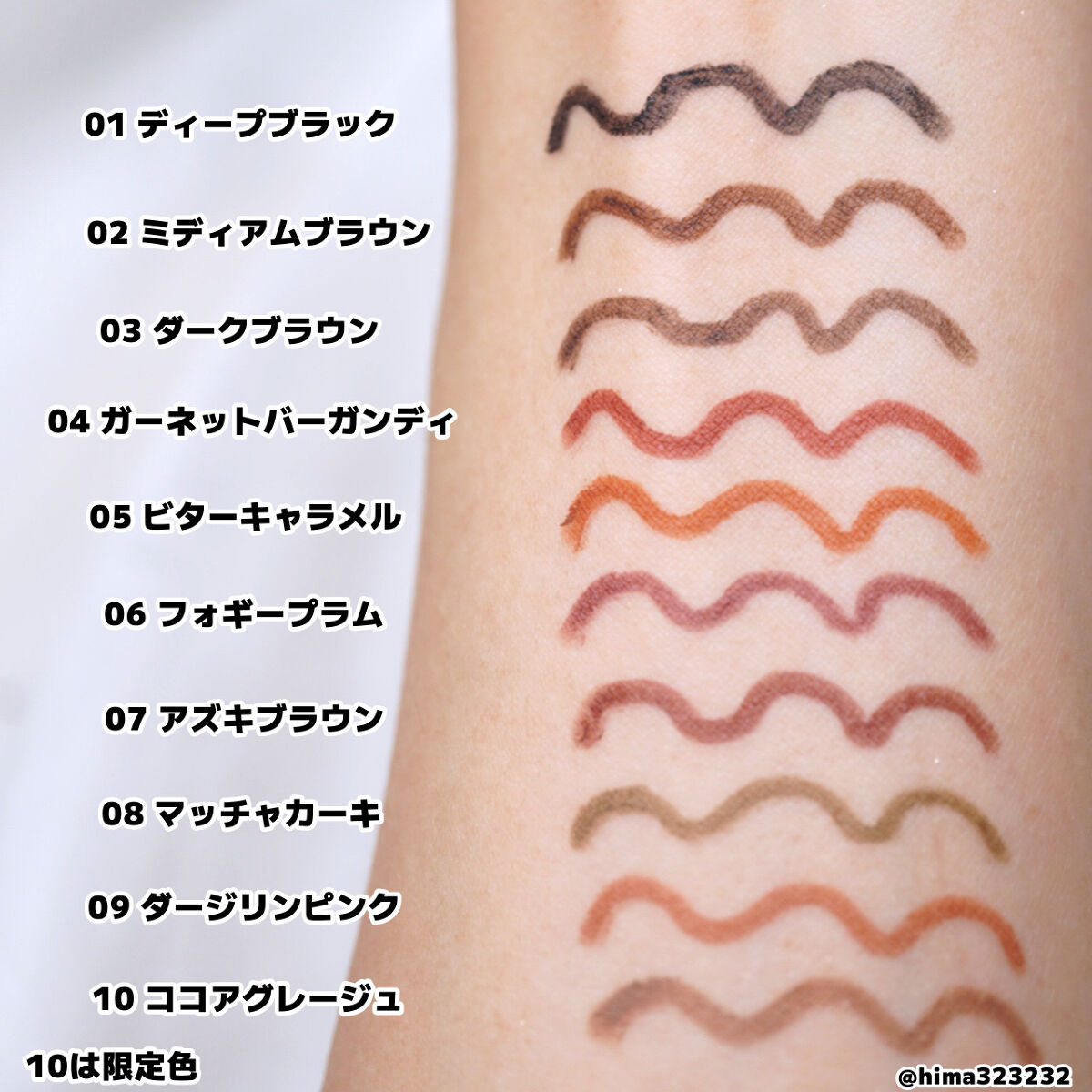 - <01 ディープブラック> メチルトリメチコン、トリメチルシロキシケイ酸、(アクリレーツ/アクリル酸ステアリル/メタクリル酸ジメチコン)コポリマー、ポリエチレン、カルナウバロウ、キャンデリラロウ、ジメチコン、水添レシチン、シリカ、メタクリル酸メチルクロスポリマー、トコフェロール、スクワラン、ホホバ種子油、マカデミア種子油、ヒアルロン酸Na、メチコン、(+/-)水酸化Al、酸化鉄、マイカ、酸化チタン <02 ミディアムブラウン> メチルトリメチコン、トリメチルシロキシケイ酸、(アクリレーツ/アクリル酸ステアリル/メタクリル酸ジメチコン)コポリマー、ポリエチレン、カルナウバロウ、キャンデリラロウ、ジメチコン、水添レシチン、シリカ、メタクリル酸メチルクロスポリマー、トコフェロール、スクワラン、ホホバ種子油、マカデミア種子油、ヒアルロン酸Na、メチコン、(+/-)水酸化Al、酸化鉄、マイカ、酸化チタン <03 ダークブラウン> メチルトリメチコン、トリメチルシロキシケイ酸、(アクリレーツ/アクリル酸ステアリル/メタクリル酸ジメチコン)コポリマー、ポリエチレン、カルナウバロウ、スクワラン、ジメチコン、水添レシチン、シリカ、トコフェロール、メタクリル酸メチルクロスポリマー、キャンデリラロウ、ホホバ種子油、マカデミア種子油、ヒアルロン酸Na、メチコン、水酸化Al、酸化鉄、酸化チタン、マイカ <04 ガーネットバーガンディ> メチルトリメチコン、トリメチルシロキシケイ酸、(アクリレーツ/アクリル酸ステアリル/メタクリル酸ジメチコン)コポリマー、ポリエチレン、カルナウバロウ、ジメチコン、キャンデリラロウ、水添レシチン、シリカ、トコフェロール、メタクリル酸メチルクロスポリマー、スクワラン、ホホバ種子油、マカデミア種子油、ヒアルロン酸Na、メチコン、水酸化Al、酸化鉄、グンジョウ、酸化チタン、マイカ <06 フォギープラム> メチルトリメチコン、トリメチルシロキシケイ酸、(アクリレーツ/アクリル酸ステアリル/メタクリル酸ジメチコン)コポリマー、ポリエチレン、カルナウバロウ、ジメチコン、キャンデリラロウ、水酸化Al、水添レシチン、シリカ、トコフェロール、メタクリル酸メチルクロスポリマー、スクワラン、ホホバ種子油、マカデミア種子油、ヒアルロン酸Na、メチコン、酸化鉄、グンジョウ、酸化チタン、マイカ <07 アズキブラウン> メチルトリメチコン、トリメチルシロキシケイ酸、(アクリレーツ/アクリル酸ステアリル/メタクリル酸ジメチコン)コポリマー、ポリエチレン、カルナウバロウ、キャンデリラロウ、ジメチコン、水添レシチン、シリカ、トコフェロール、メタクリル酸メチルクロスポリマー、スクワラン、ホホバ種子油、マカデミア種子油、水酸化Al、ハイドロゲンジメチコン、ヒアルロン酸Na、メチコン、酸化鉄、グンジョウ、マイカ、酸化チタン <09 ダージリンピンク> メチルトリメチコン、トリメチルシロキシケイ酸、(アクリレーツ/アクリル酸ステアリル/メタクリル酸ジメチコン)コポリマー、合成ワックス、カルナウバロウ、キャンデリラロウ、ジメチコン、水酸化Al、ハイドロゲンジメチコン、水添レシチン、シリカ、トコフェロール、メタクリル酸メチルクロスポリマー、スクワラン、ホホバ種子油、マカデミア種子油、ヒアルロン酸Na、メチコン、酸化鉄、酸化チタン、マイカ、グンジョウ <11 クラウディーグレー> メチルトリメチコン、トリメチルシロキシケイ酸、(アクリレーツ/アクリル酸ステアリル/メタクリル酸ジメチコン)コポリマー、合成ワックス、カルナウバロウ、ジメチコン、キャンデリラロウ、水酸化Al、水添レシチン、シリカ、トコフェロール、メタクリル酸メチルクロスポリマー、ハイドロゲンジメチコン、スクワラン、ホホバ種子油、マカデミア種子油、ヒアルロン酸Na、メチコン、酸化鉄、酸化チタン、マイカ <15 カプチーノピンク> メチルトリメチコン、トリメチルシロキシケイ酸、(アクリレーツ/アクリル酸ステアリル/メタクリル酸ジメチコン)コポリマー、合成ワックス、カルナウバロウ、ジメチコン、キャンデリラロウ、水酸化Al、水添レシチン、シリカ、トコフェロール、メタクリル酸メチルクロスポリマー、スクワラン、ホホバ種子油、マカデミア種子油、ヒアルロン酸Na、メチコン、酸化チタン、酸化鉄、マイカ <05 ビターキャラメル> メチルトリメチコン、トリメチルシロキシケイ酸、(アクリレーツ/アクリル酸ステアリル/メタクリル酸ジメチコン)コポリマー、ポリエチレン、カルナウバロウ、ジメチコン、キャンデリラロウ、水添レシチン、シリカ、トコフェロール、メタクリル酸メチルクロスポリマー、スクワラン、ホホバ種子油、マカデミア種子油、ヒアルロン酸Na、メチコン、水酸化Al、酸化鉄、マイカ、酸化チタン <08 マッチャカーキ> メチルトリメチコン、トリメチルシロキシケイ酸、(アクリレーツ/アクリル酸ステアリル/メタクリル酸ジメチコン)コポリマー、合成ワックス、