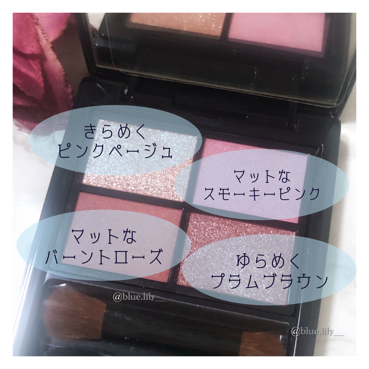 上質なシルキーな粉感もさすがのゲランで好みです。瞼にしっかりと密着して深みのある発色を叶えてくれます。 セミマットなベージュやシアーブラックの上にシルバーパールやサテンの艶めきのあるモーブグレージュを重ねるとなんとも美しいツヤが瞼を彩ってくれます 一見パールシルバーが派手に見えますがブラシでふわりと乗せることで月明かりを宿したような上品な艶感を添えてくれます
