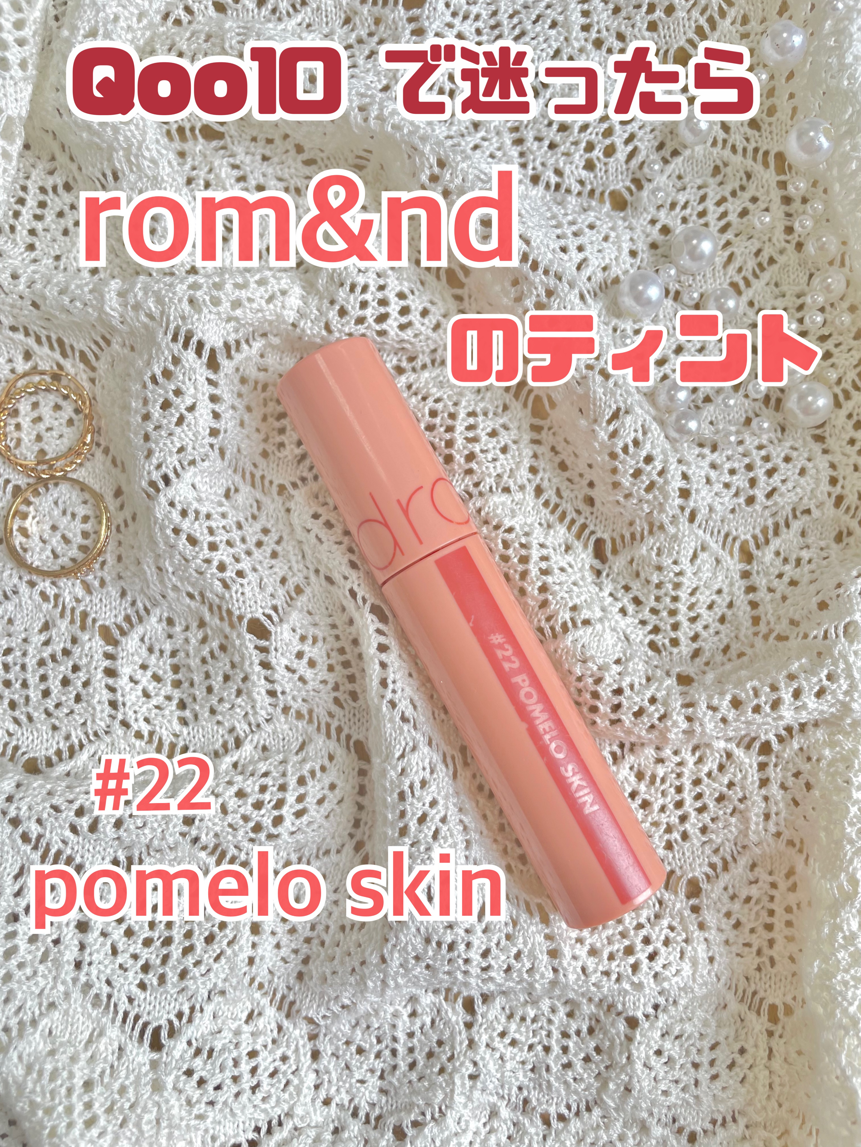 rom&ndのジューシーラスティングティント#22pomeoskinのレビューです(^-^)色はピンクベージュ系で、とてもナチュラルですオレンジ味があるのでイエベさん(春かな)におすすめです色持ちはそこまで濃く残りませんが、朝に塗っておくと、...