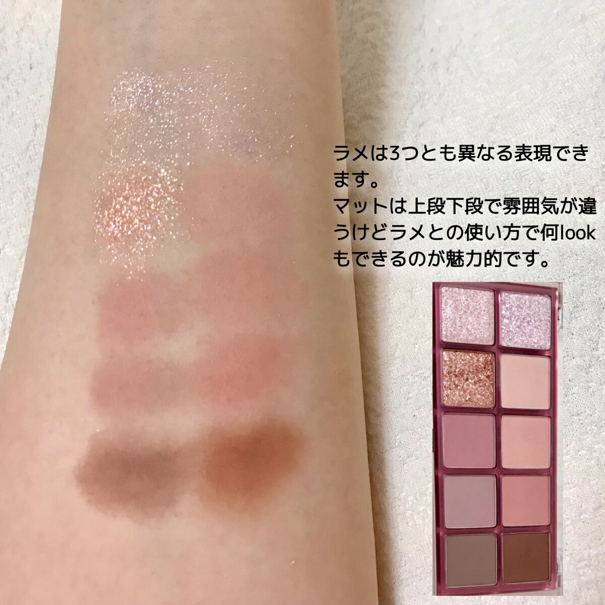 粉細かいサラサラなのにしっとり感のある粉質マット、シマー、ラメ、グリッターの配分神ブラシへの粉含み良し 配色は勿論のことラメにもこだわりを感じる一色だけでなく数色のラメが密度高く詰まっているためいろんな角度からラメを楽しめる! 韓国といえば…ラメ!なのにシマーが素敵!涙袋、目頭、黒目上にのせるとチラチラしてかわいいマットを引き立たせることもできるしグリッターを引き立たせることもできる万能なアイシャドウ