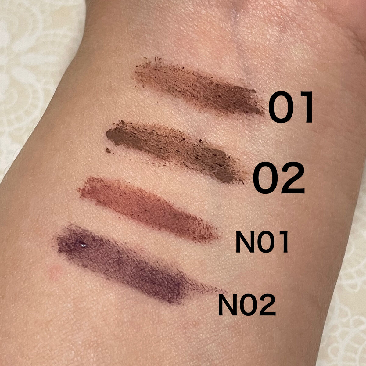 どちらもクリームタイプのアイシャドウ。しっとりしているけどクリームですが、するっと広げられます。どちらも繊細なパール入り。パールのキラキラが上品なので目元が綺麗に輝きます✨ 01はその名の通りオレンジブラウン。若干のゴールドの印象もあり✨発色がいいので少しずつ目元にのせるのがお薦め。グラデーションを作ればこれ一色アイメイクが完成します。これはイエベさんに大人気のカラーだとわかります!!これは売れるなと思いました。 03はピンクベージュ。落ち着いた色味ですが、ピンクラメが入っていて、目元が綺麗に見えます。ブルベの私は01より03の方が好みのカラー。これ一色ではメイクが完成しないの私はこの上からマットや他の色を重ねていきたいと思います😍これからベースのアイシャドウとして活躍しそうな予感😄