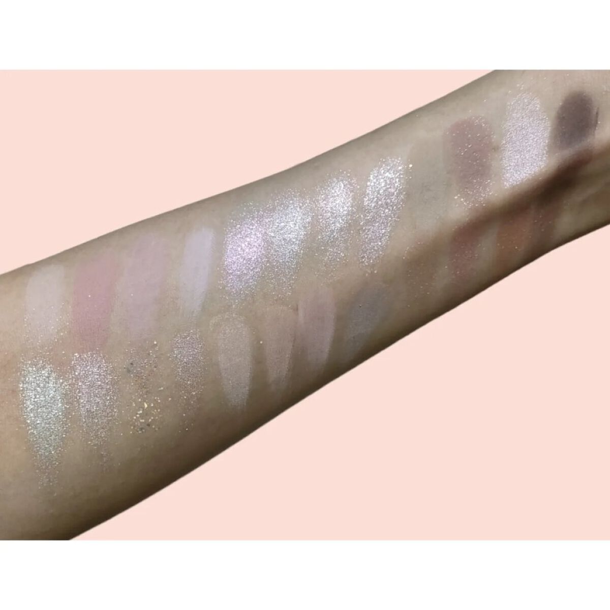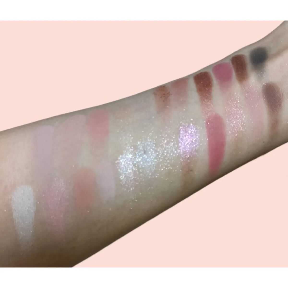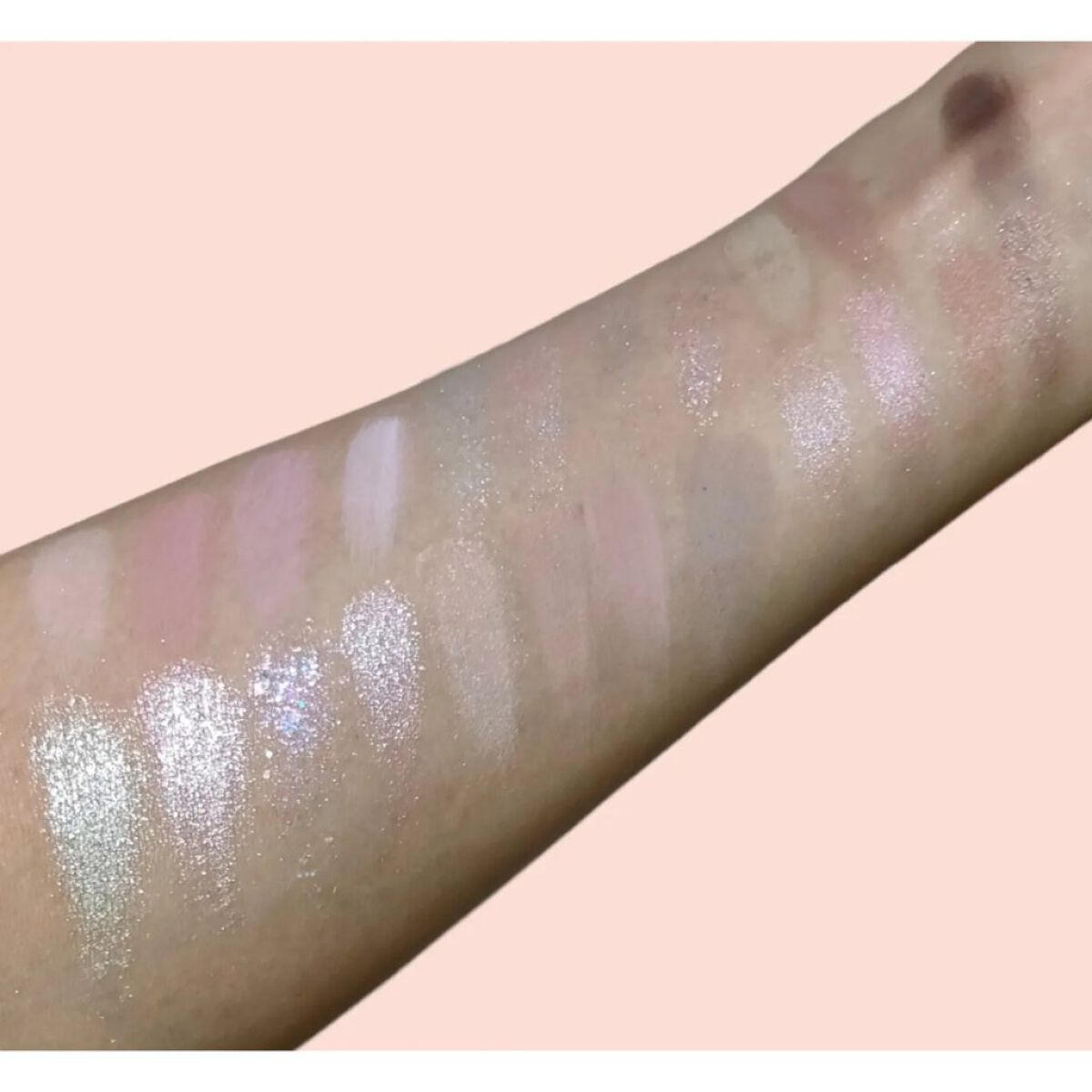 全部ラメ!キラキラ好き大歓喜のパレット😍😍😍 左下2色のグリッターはしっとりぺたぺたしている質感で瞼にしっかりくっついてくれます! ざっくり言うと上段はキラキラ中段はツヤツヤ下段はギラギラというイメージです。 全体的に色づきは控えめでラメ感を楽しめる🥳 全部キラッキラの宝石みたいな多色ラメですが、上段は青ラメ、中段はピンクラメ、下段はゴールドラメが目立つなーと思いました💖 名前も可愛い☁