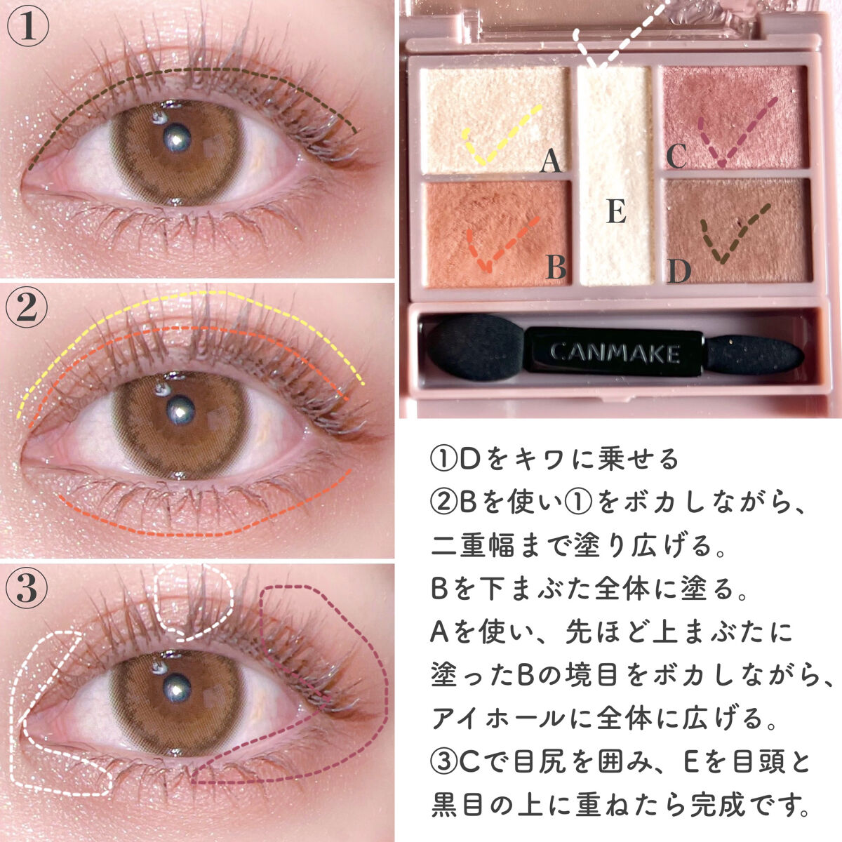 - 1枚のパレットで2つのスタイルが完成! 5色の欲ばりアイシャドウ♥ メインカラーを選んで2つのスタイルが楽しめる! A→B→D でスタイル1 A→C→D でスタイル2 繊細な粉質が、しっとりとまぶたに密着して色落ちを防ぎます。 透明感のあるキラうるトッピングジュエル(繊細ラメ)は、気分によってトッピング!